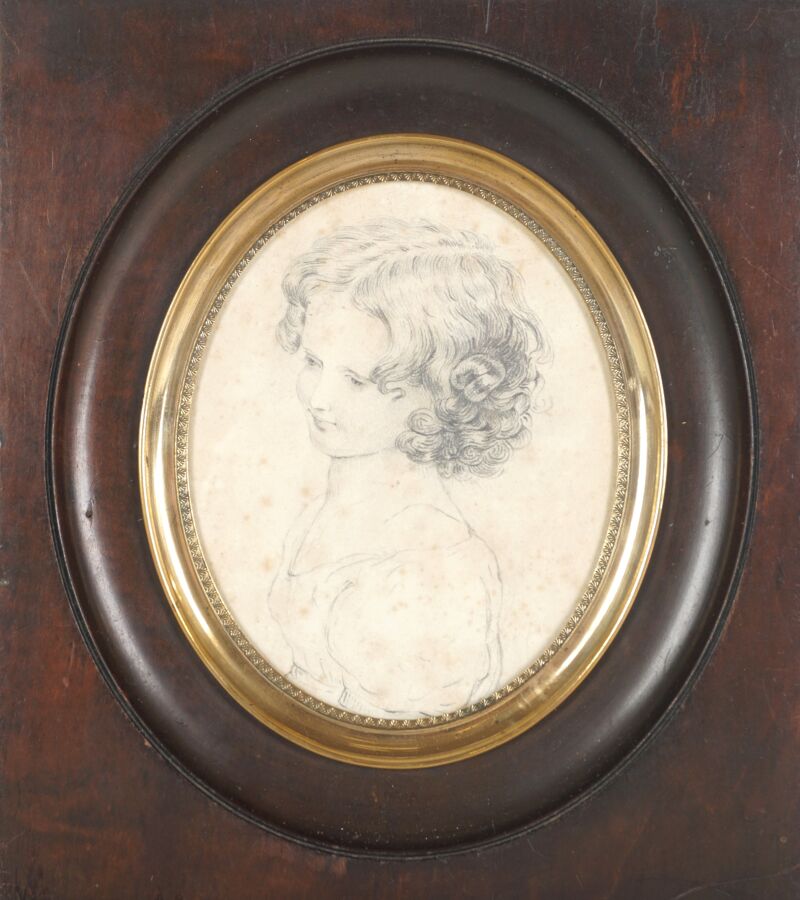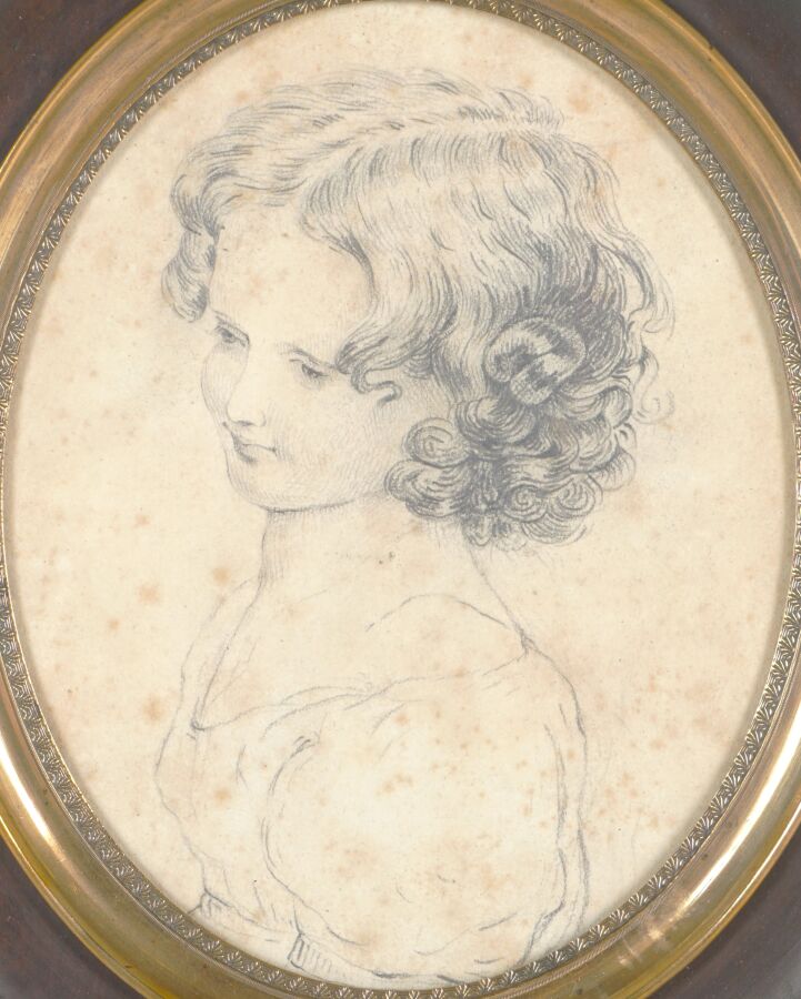 École française du 19ème siècle, "Jeune fille de profil", dessin au crayon sur papier, non signé, format médaillon, 14 x 11.5 cm (à vue) (rousseurs).