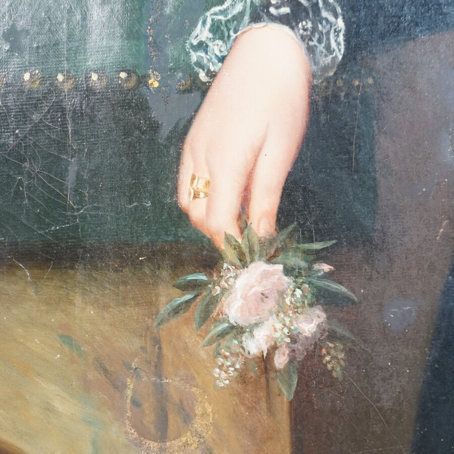 Ecole française du 19ème siècle, "La dame aux camées", huile sur toile non signée, 103 x 83 cm (quelques usures et accidents à la toile, restaurations, manques au cadre).