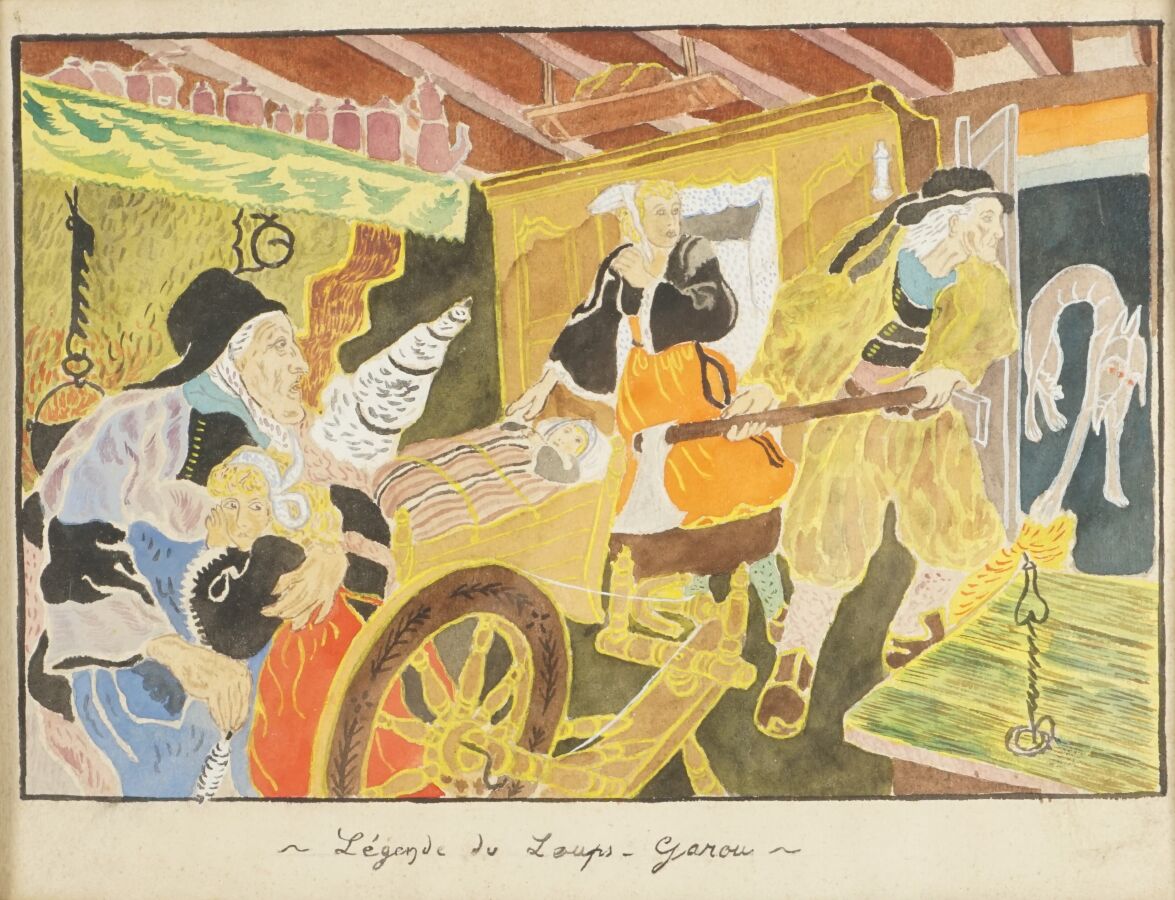 Ecole française du 19ème siècle, "Légende du Loup-garou", aquarelle et gouache sur papier, non signée, titrée au centre, 24 x 31 cm.