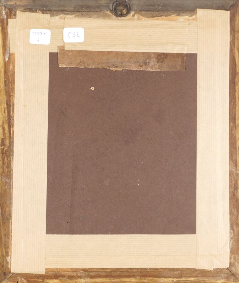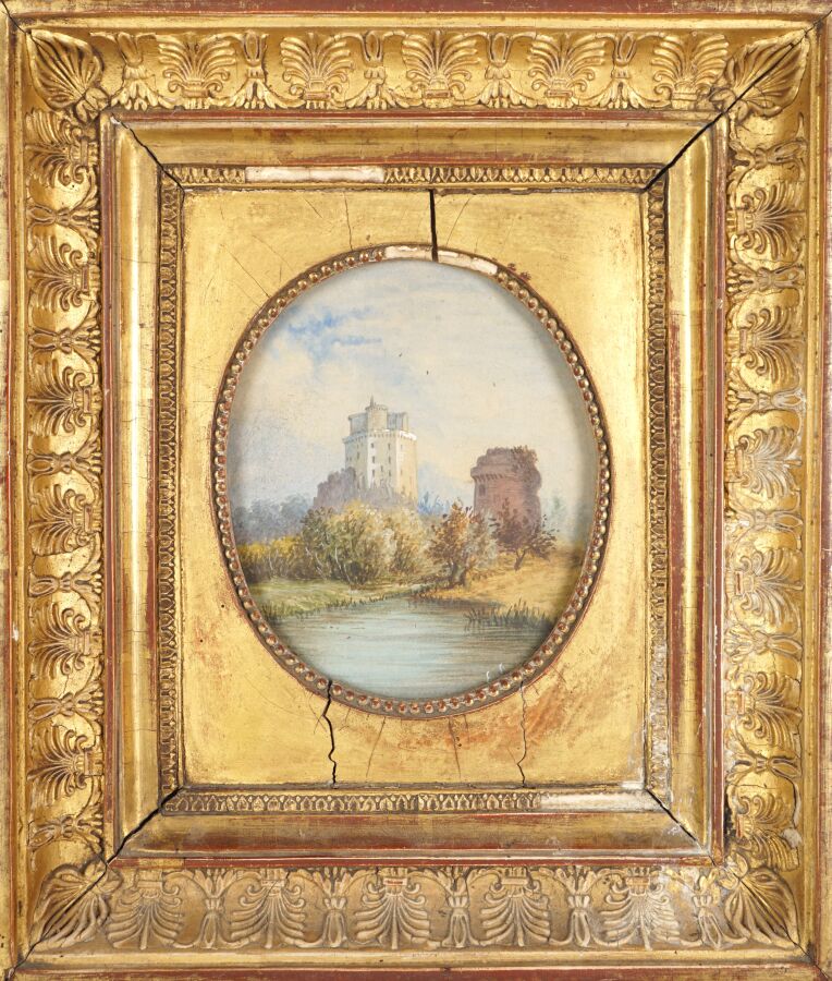 École française du 19ème siècle, "Paysage lacustre à la tour", aquarelle non signée, format médaillon, 15 x 12 cm (à vue).