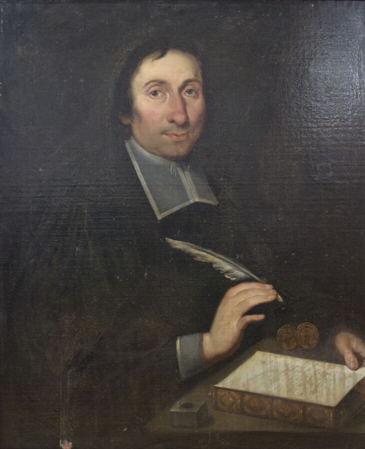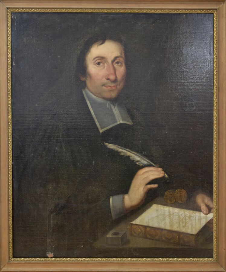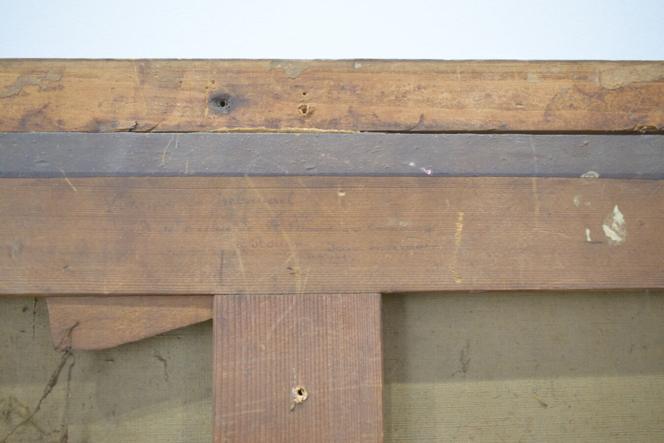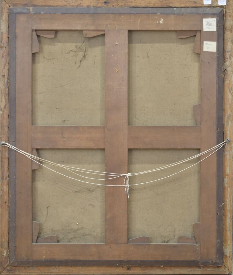 École française du 19ème siècle, "Portrait d'un curé de l'église de Saint-Étienne-des-Tonneliers de Rouen", huile sur toile, inscription au verso indiquant l'identité du personnage (Jérome de Grebouval ?). 73,5 x 60,5 cm. (rentoilage, manques, salissures, restaurations.)