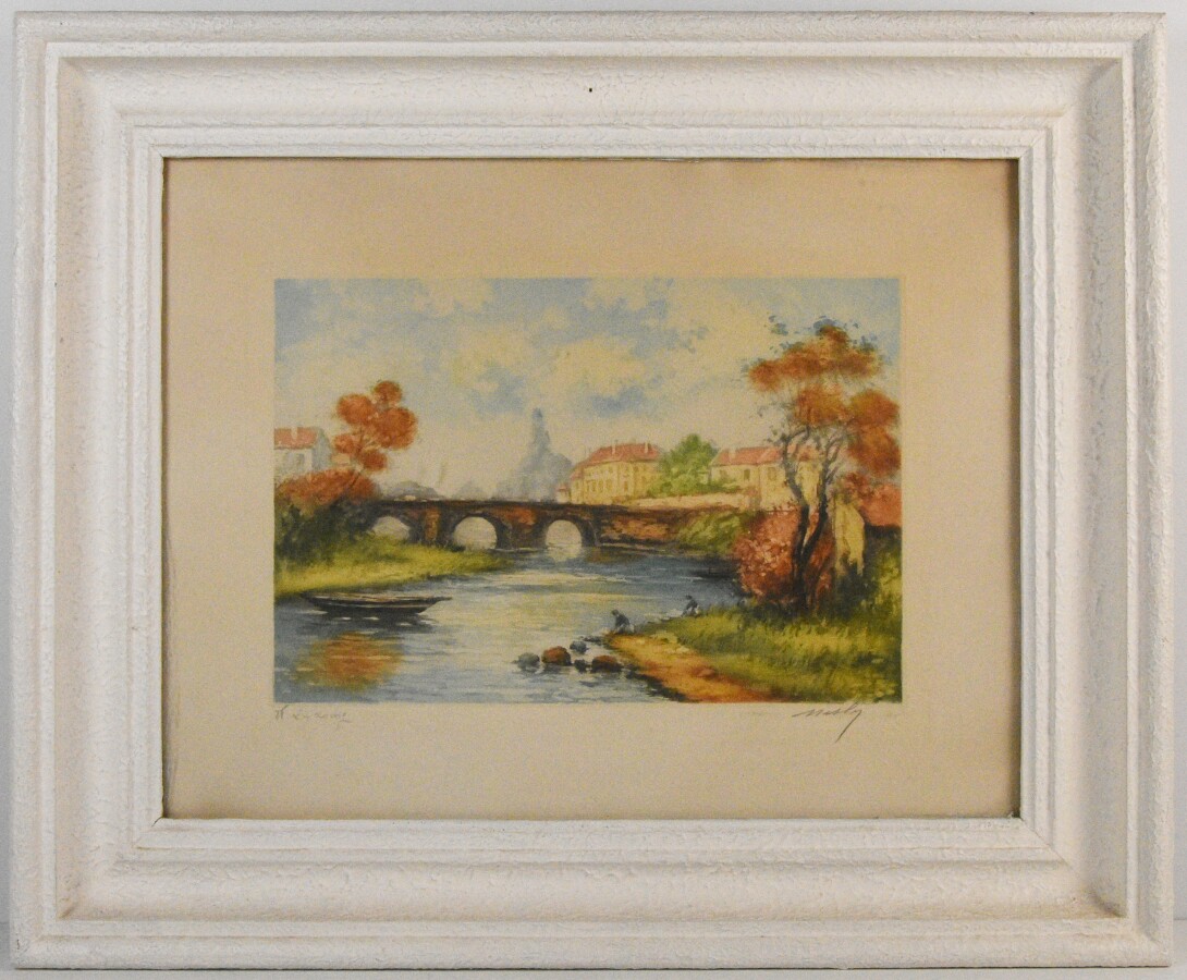 Ecole française du 20e siècle, "Le Loing" 25, lithographie couleur, porte une signature en bas à droite dans la planche, datée et située en bas à gauche, 21.5 x 32 cm (à vue).