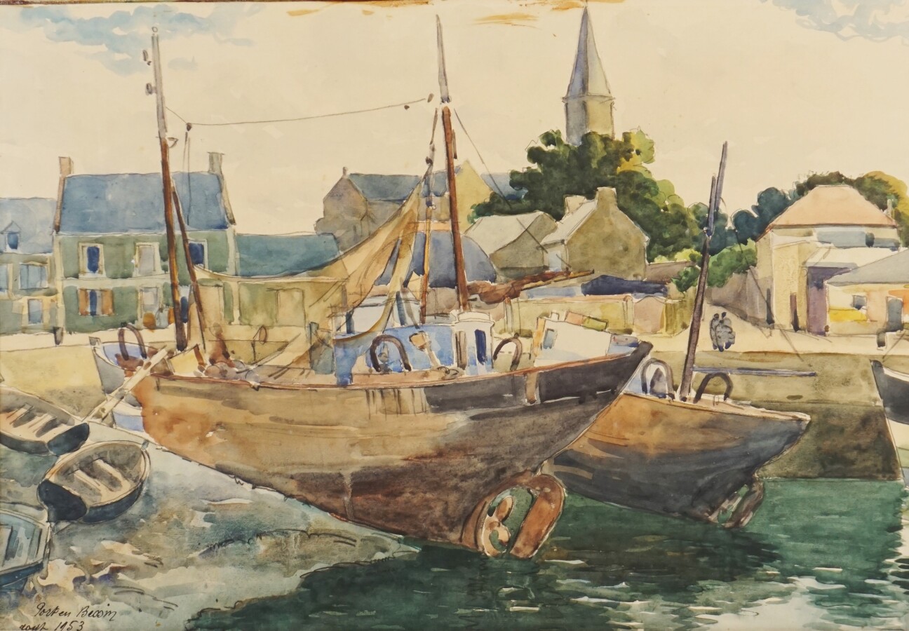 Ecole française du 20e siècle, "Port en Bessin" avril 1953, dessin et aquarelle sur papier, situé et daté en bas à gauche, 36 x 51 cm (taches).