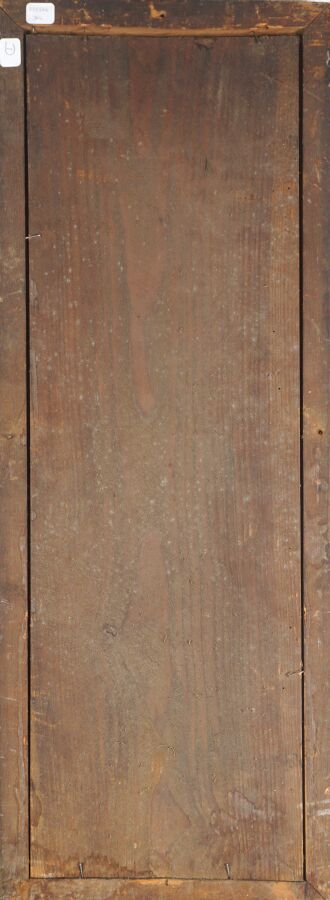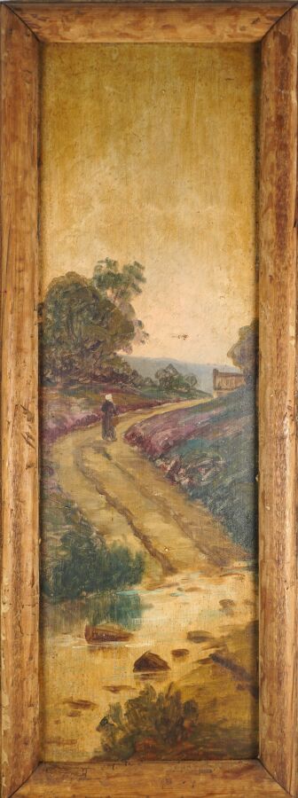 École française du 20ème siècle, "Bretonne sur le chemin", huile sur panneau non signée, 65.5 x 21 cm.