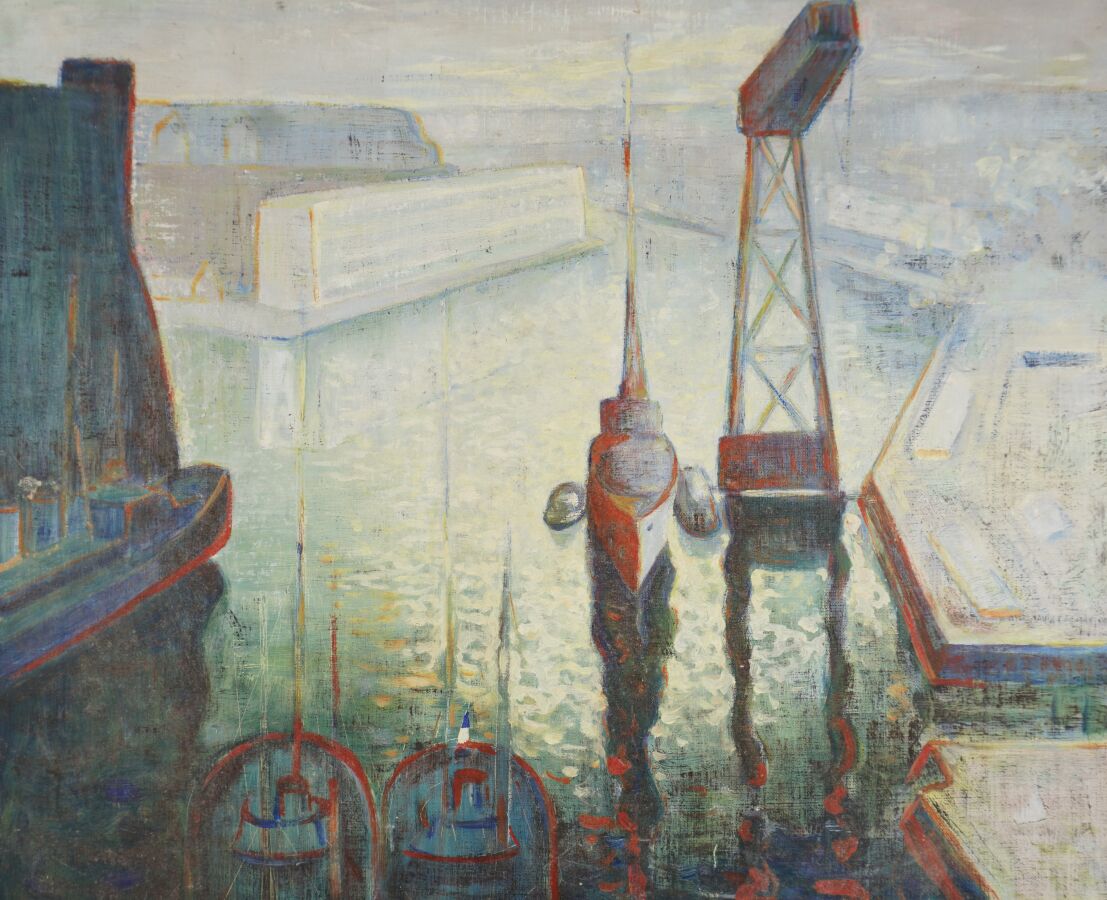 Ecole française du 20ème siècle, "Chantier naval", huile sur toile non signée, 50.5 x 61.5 cm.