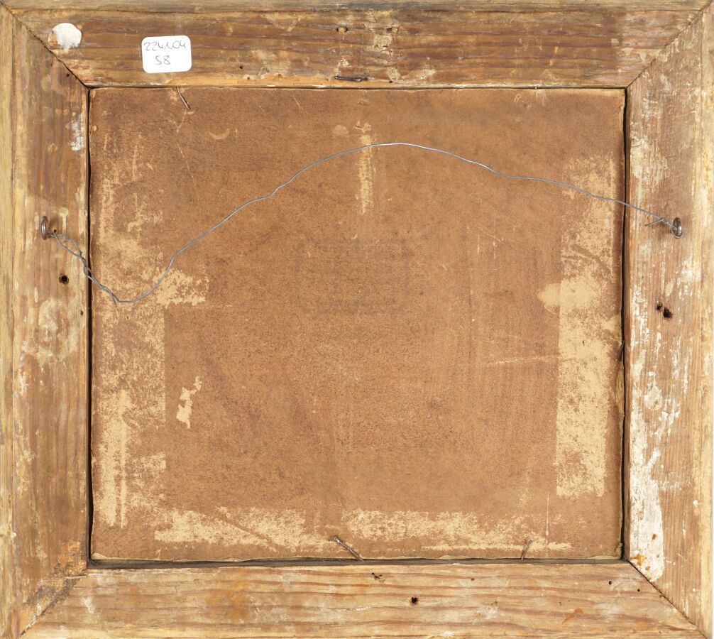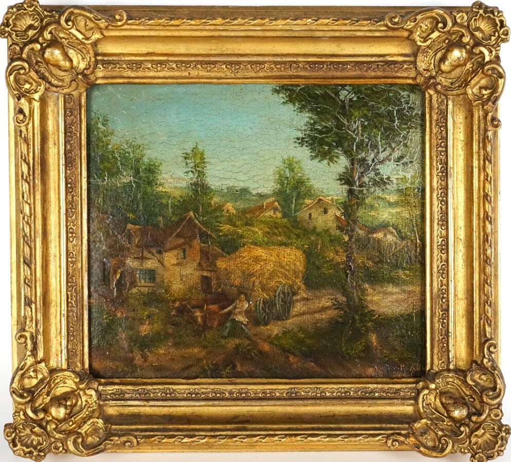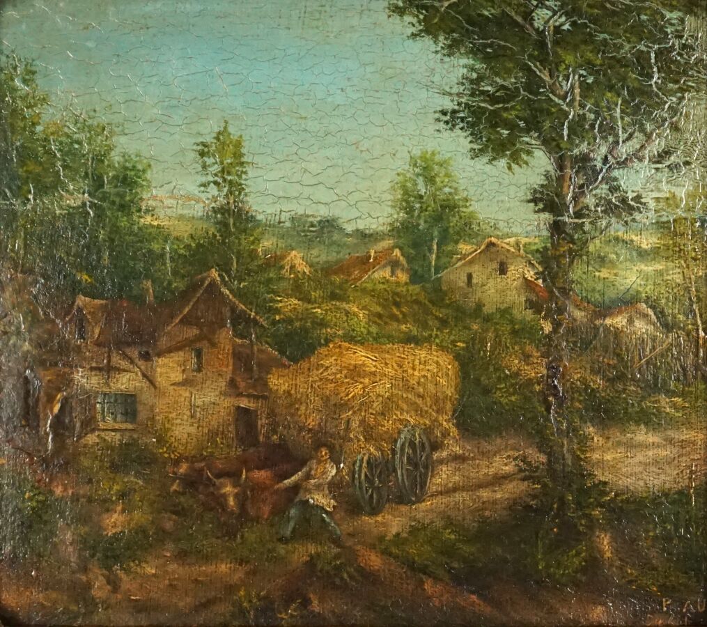 École française du 20ème siècle, "Le charretier", huile sur carton, portant une trace de signature en bas à droite, 22 x 25 cm.