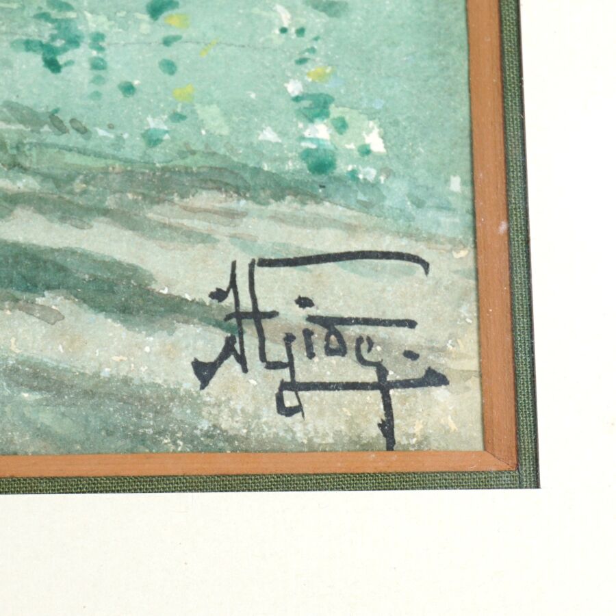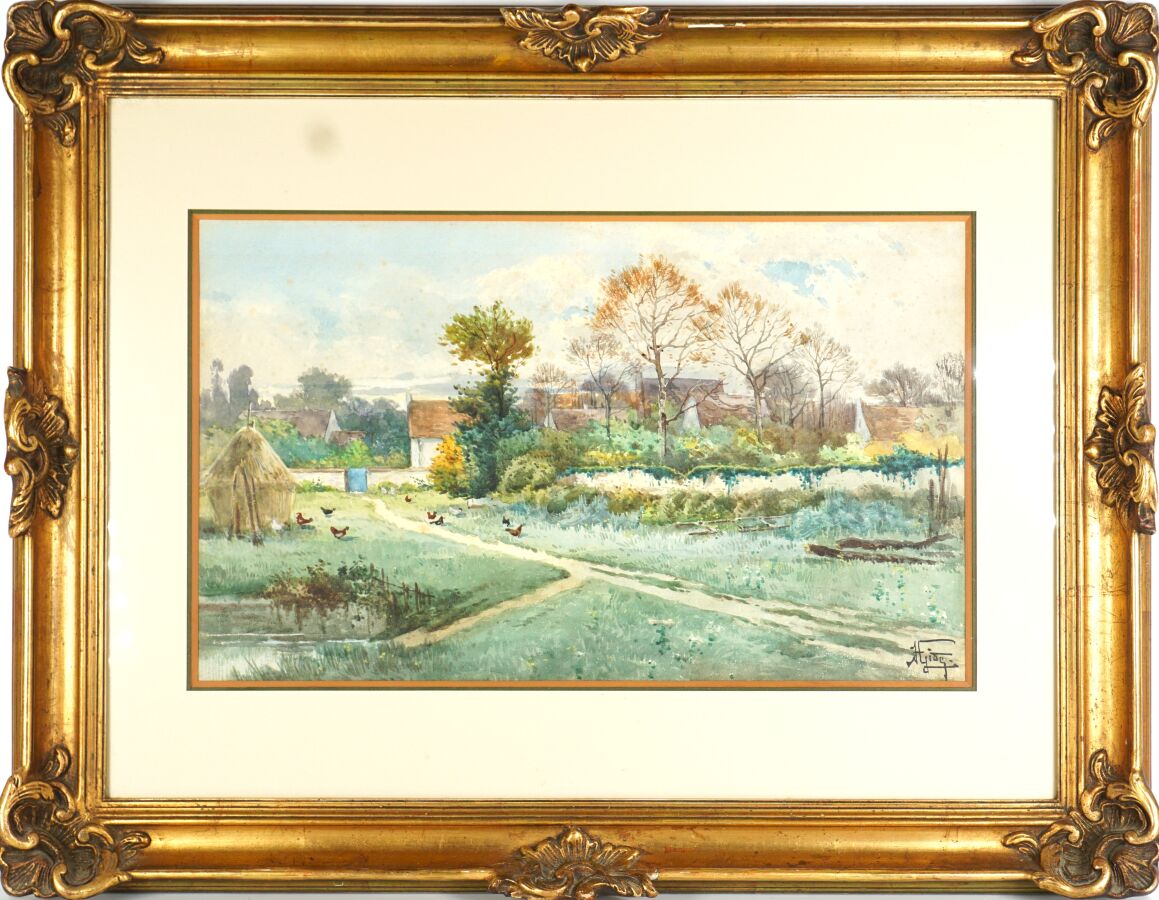 École française du 20ème siècle, "Le hameau", aquarelle sur papier portant une trace de signature en bas à droite, 27 x 46 cm (à vue).