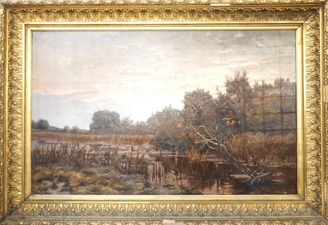 École française du 20ème siècle, "Le marais", huile sur toile, trace de signature en bas à droite, 73 x 116 cm (écaillures, manques).