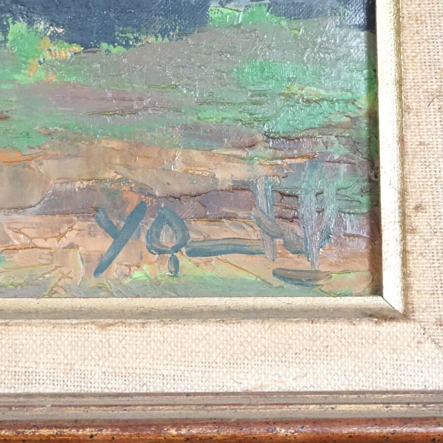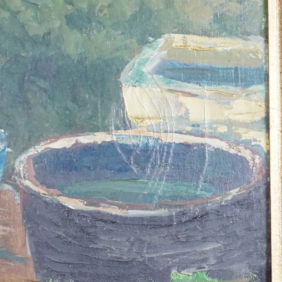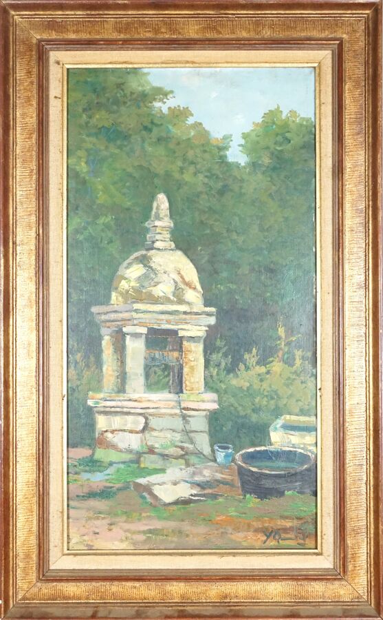 École française du 20ème siècle, "Le puits", huile sur toile, signée en bas à droite, 61 x 32 cm (écaillures).