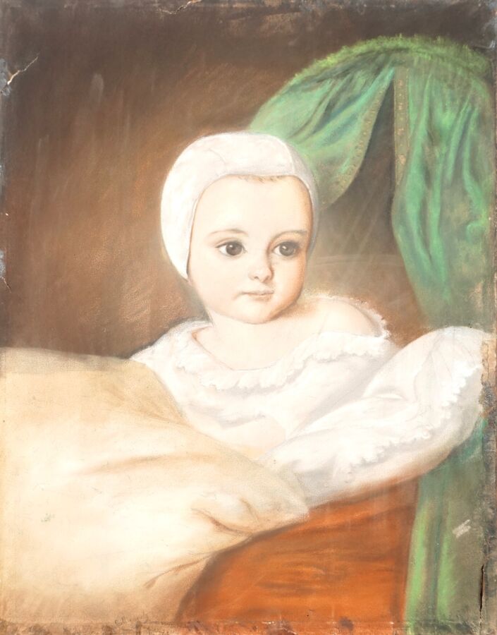 École française du 20ème siècle, "Le réveil", pastel sur papier marouflé sur panneau portant une trace de signature en bas à gauche, 42 x 33 cm.