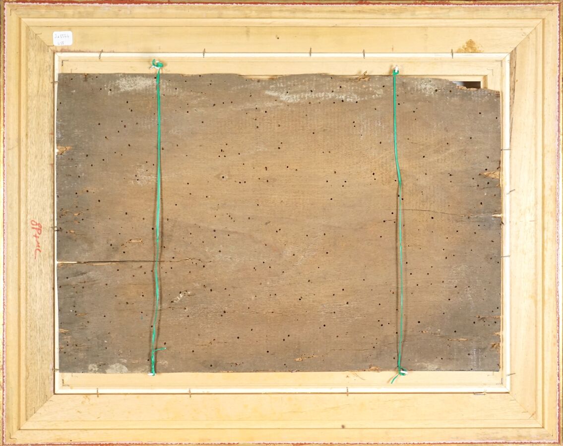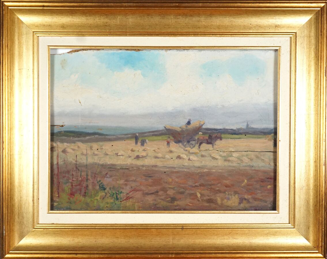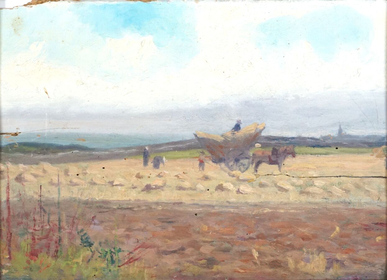 Ecole française du 20ème siècle, "Le travail au champ", huile sur panneau non signée, 33 x 50 cm (fentes, manques).