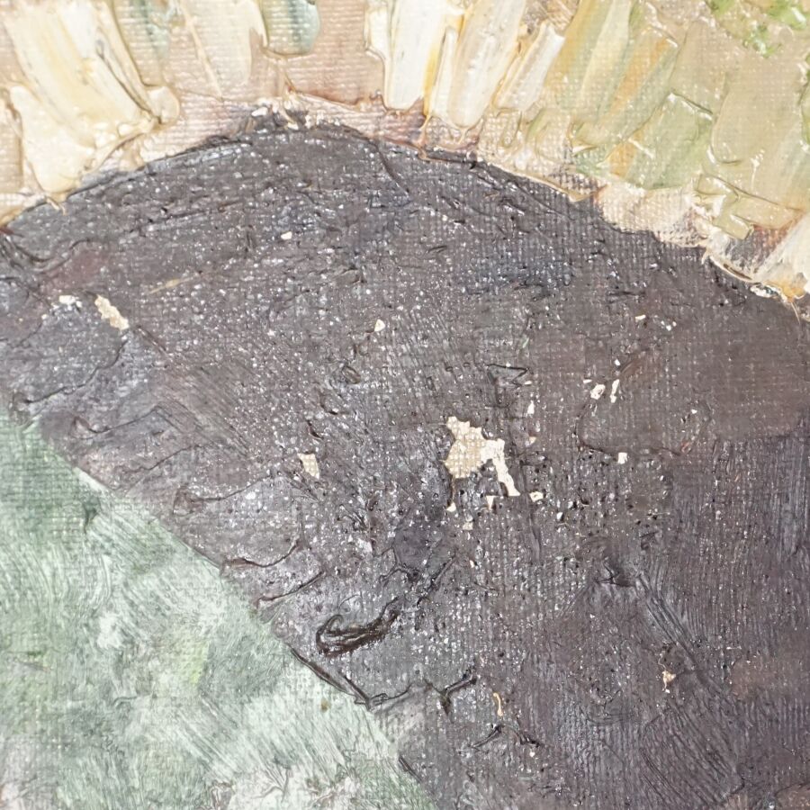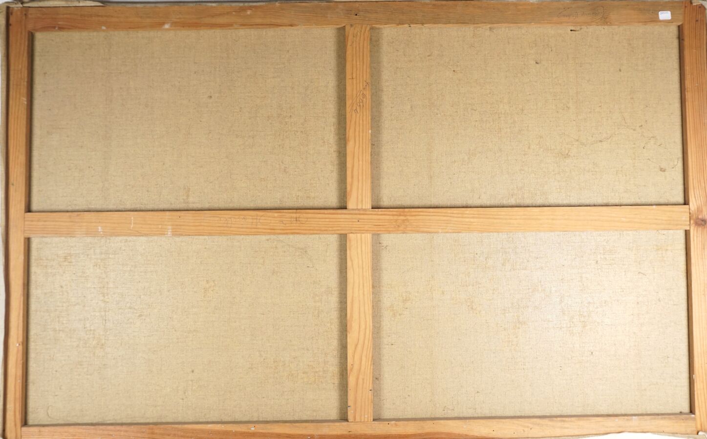 École française du 20ème siècle, "Maison au bord de l'eau", huile sur toile, signature difficilement lisible en bas à gauche, 81 x 131 cm (quelques manques).