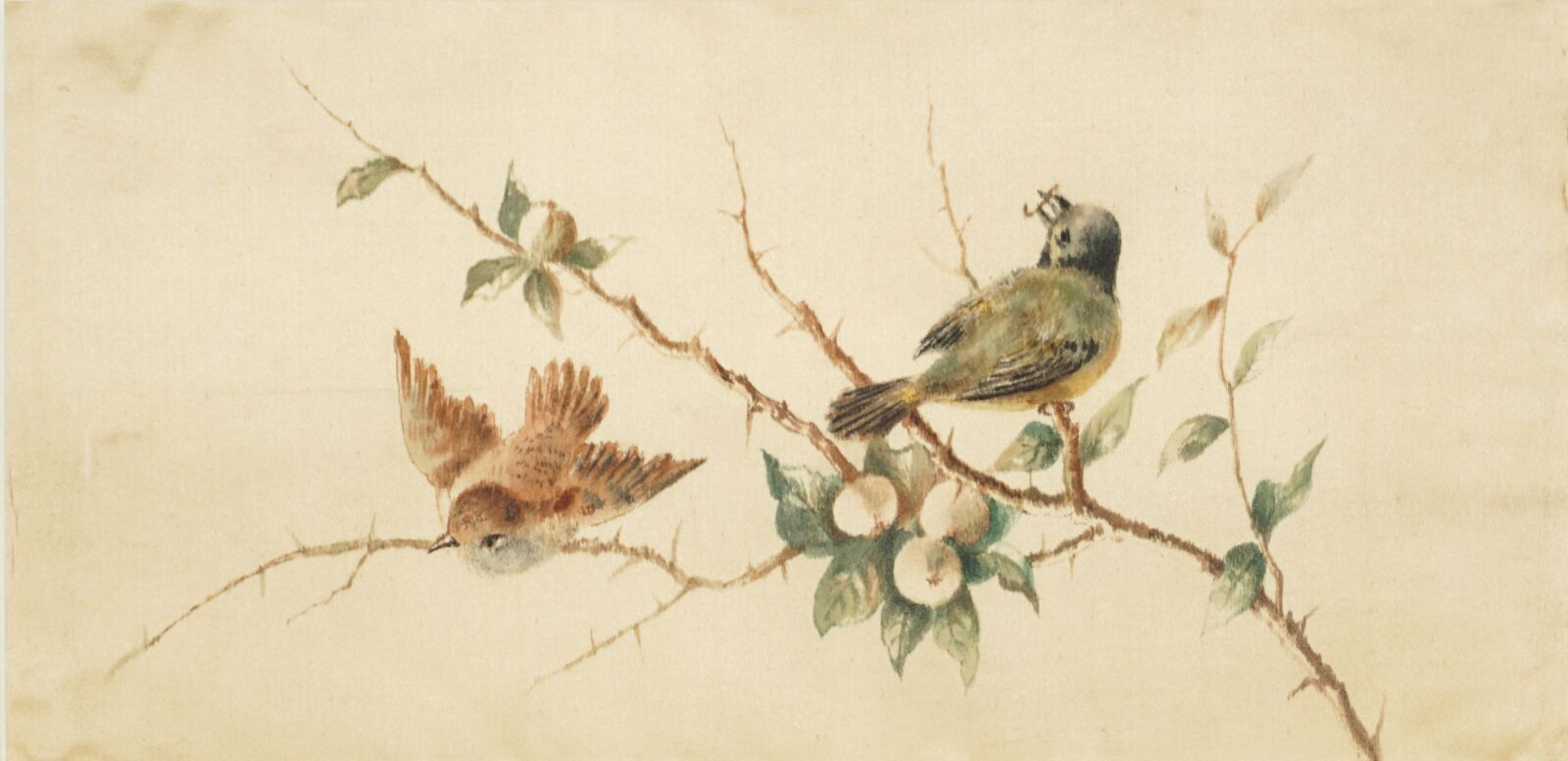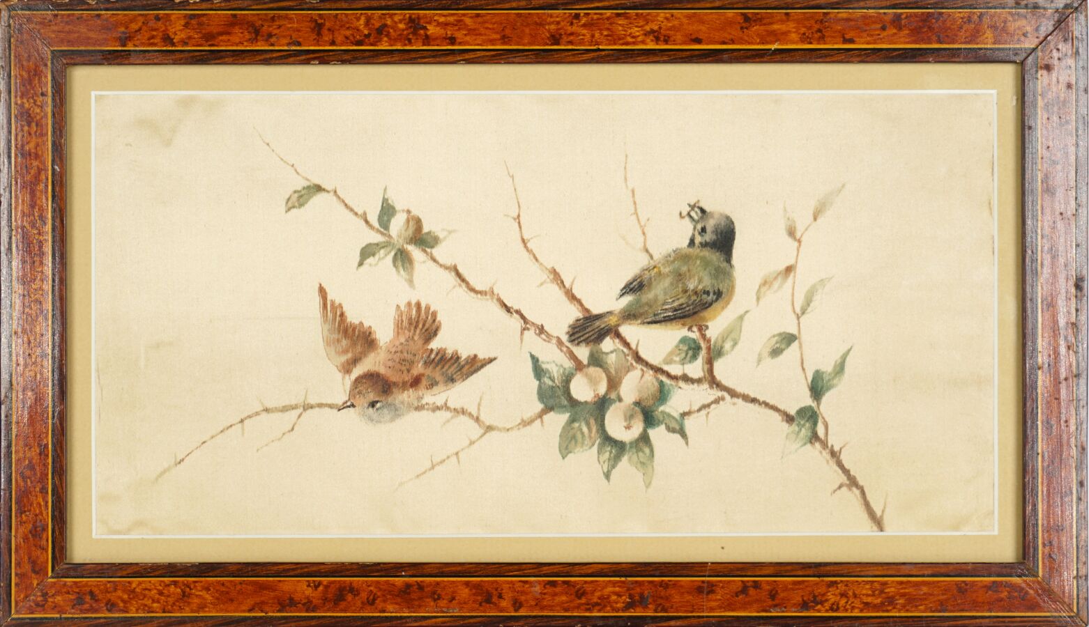 École française du 20ème siècle, "Oiseaux branchés", aquarelle sur soie non signée, 13 x 17 cm.