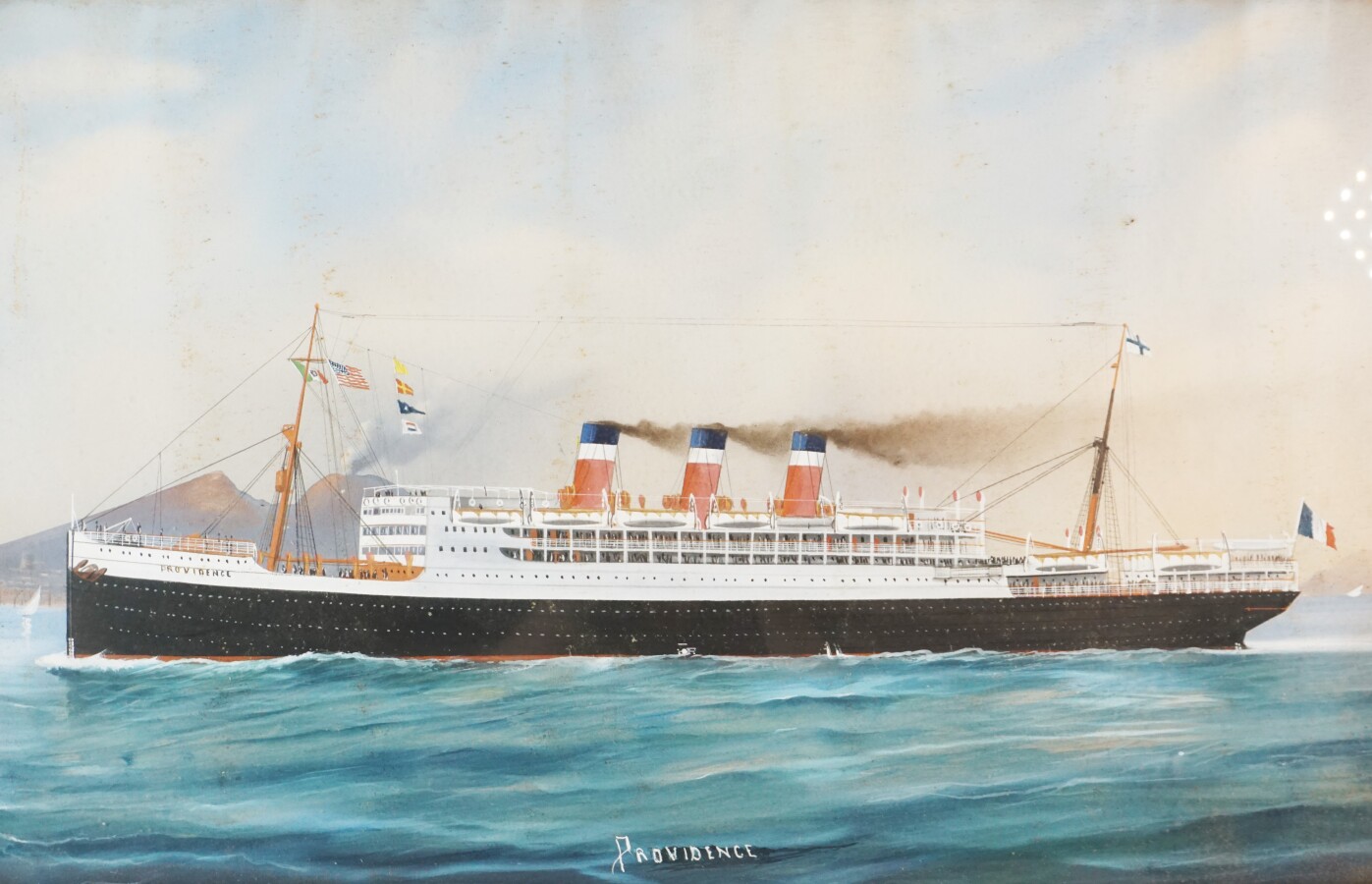 Ecole française du 20ème siècle, " Paquebot Providence ", aquarelle et gouache sur papier non signée, titrée au centre, 42 x 68 cm (encadrés sous verre).