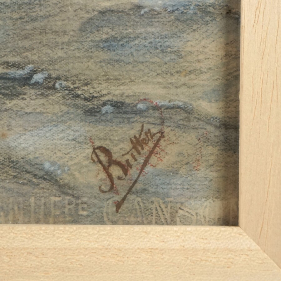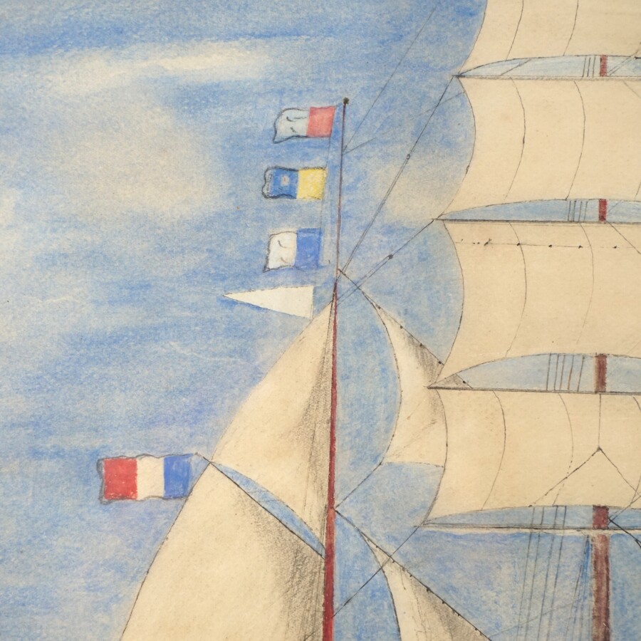 Ecole française du 20ème siècle, "Pavillon français, quatre mâts naviguant", crayon et couleurs, porte une signature en bas à droite "Butter", 44.5 x 62 cm.