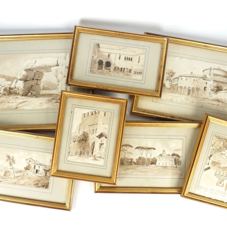 École française du 20ème siècle, "Paysages d'Italie, architecture" circa 1880, 7 lavis d'aquarelle en sépia, non signés, Dim. De la plus petite : 13.5 x 9.5 cm (à vue). Dim. De la plus grande : 14.5 x 20 cm (à vue) (un cadre à refixer).