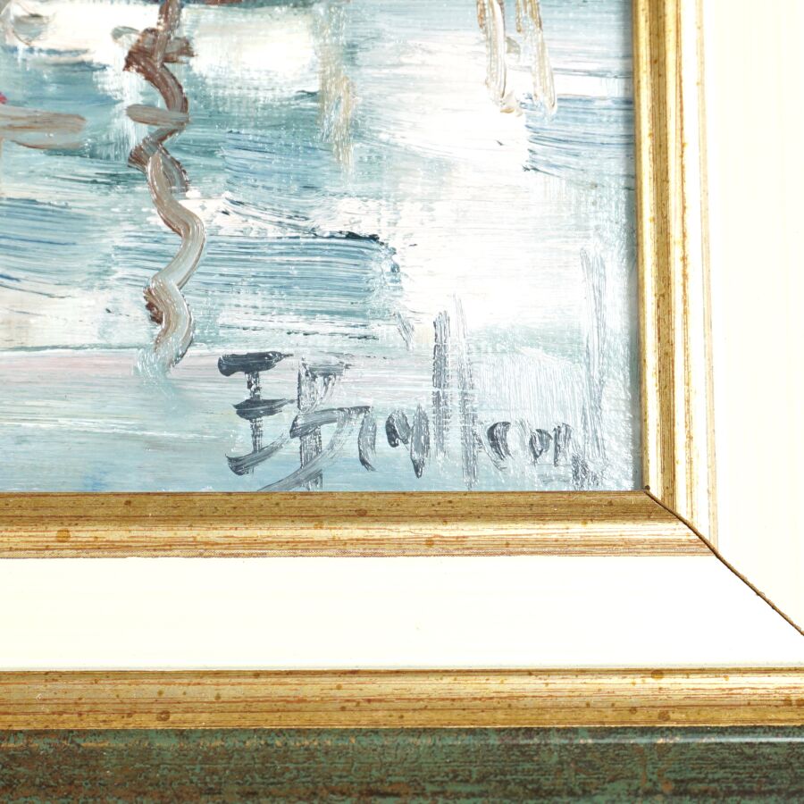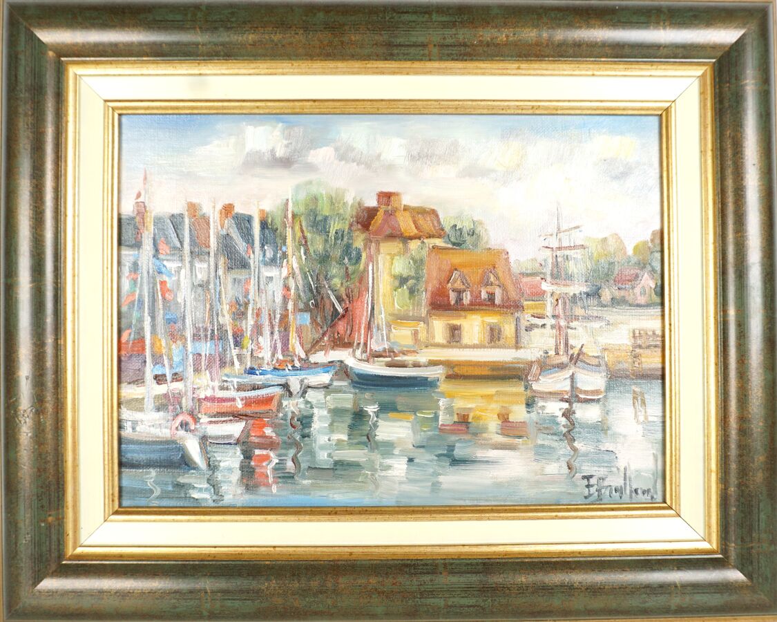 École française du 20ème siècle, "Petit port", huile sur toile porte une signature difficilement lisible en bas à droite, 23 x 32 cm.