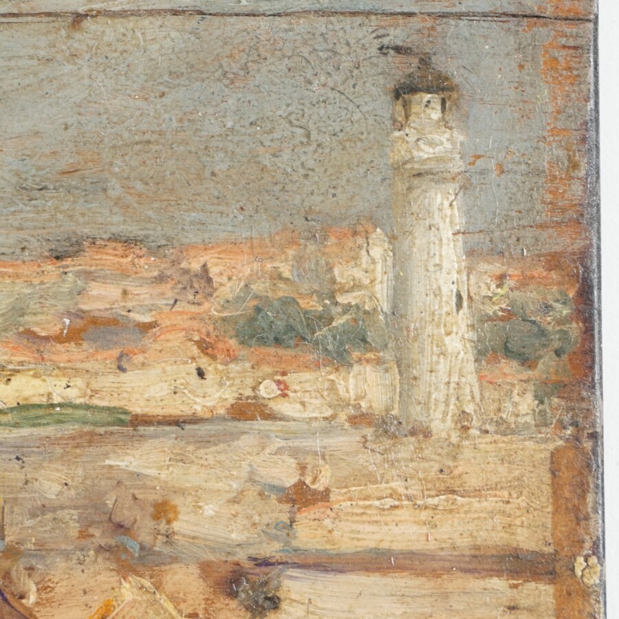 Ecole française du 20ème siècle, "Port de Méditerranée", huile sur panneau, trace de signature en bas à droite, 13 x 21.5 cm.