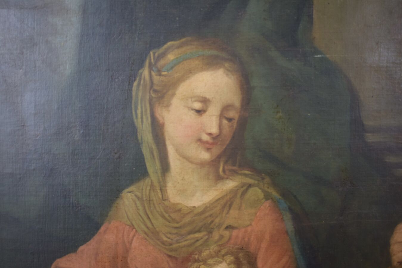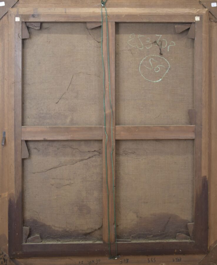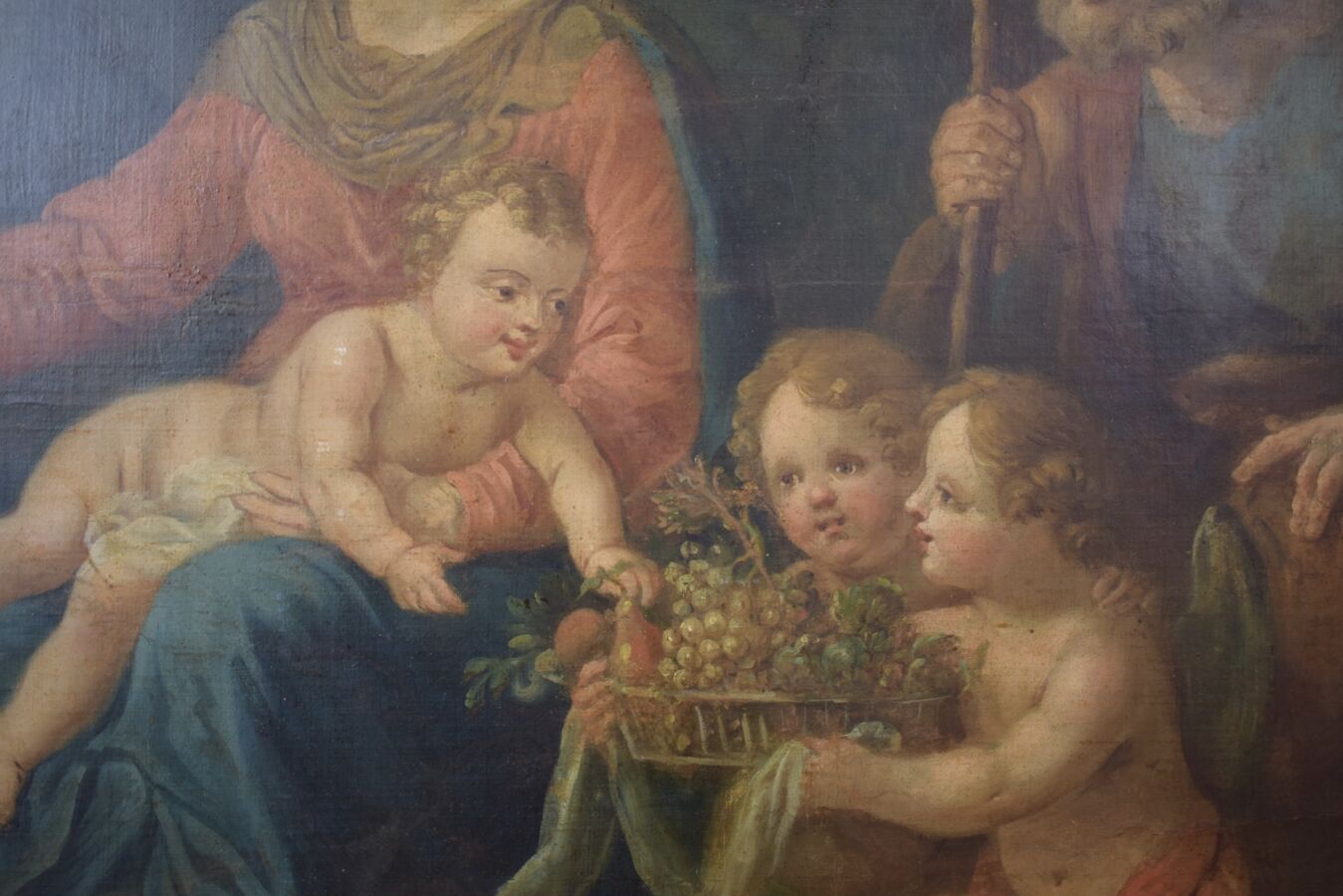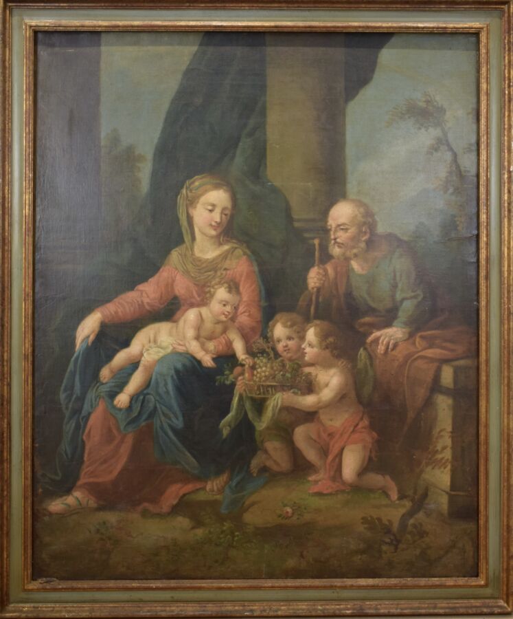 École française du début du 18ème siècle, "La Sainte Famille", huile sur toile, ancien numéro d'inventaire au dos,105 x 85 cm,(accidents, manques, traces d'humidité, restaurations, rentoilage).
