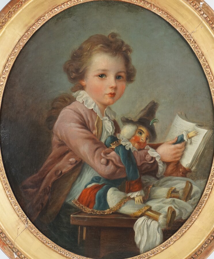 Ecole française du début du 19ème siècle, dans le goût de François Hubert DROUAIS (1727-1775), "Jeune garçon au polichinelle", huile sur toile non signée, format ovale, H. 55 cm x 46 cm.