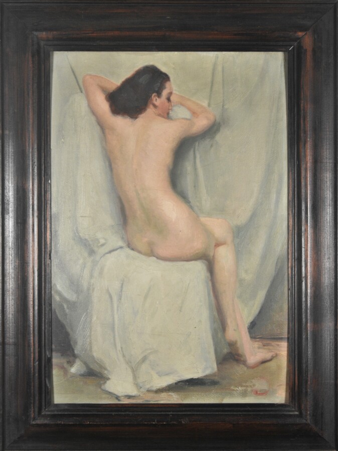 Ecole française du début du 20e siècle, "Femme nue de dos", huile sur carton, 61 x 41 cm (petit accroc).