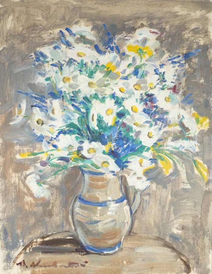 Ecole française du début du 20ème siècle, "Bouquet de fleurs", aquarelle et rehauts de gouache, porte une signature en bas à gauche, 60.5 x 46.5 cm (à vue).