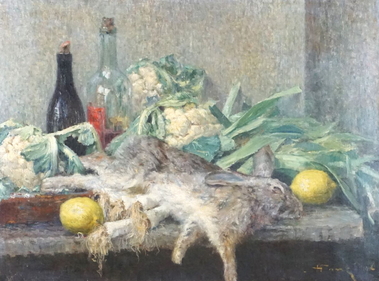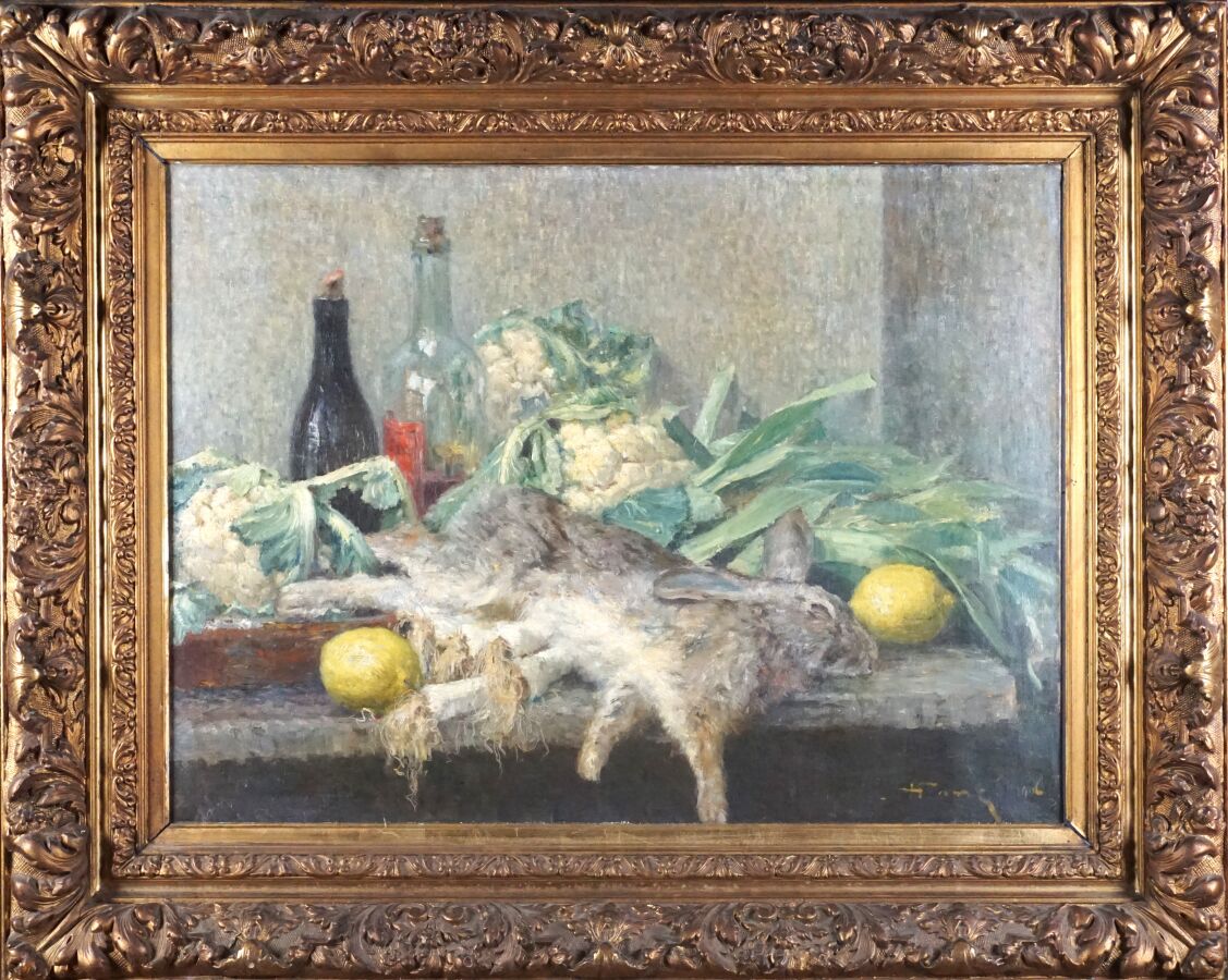 Ecole française du début du 20ème siècle, "Nature morte au lièvre et aux citrons", huile sur toile, trace de signature en bas à droite, 54 x 73 cm.