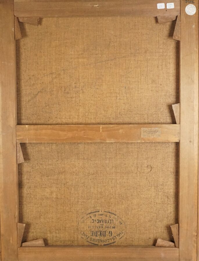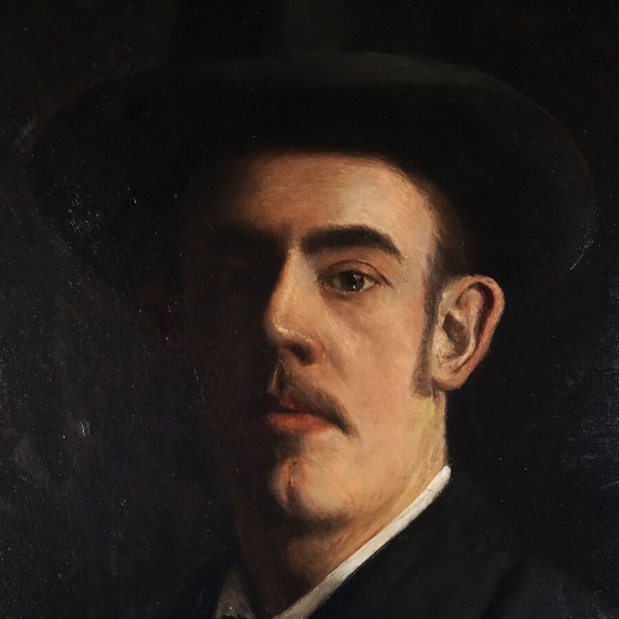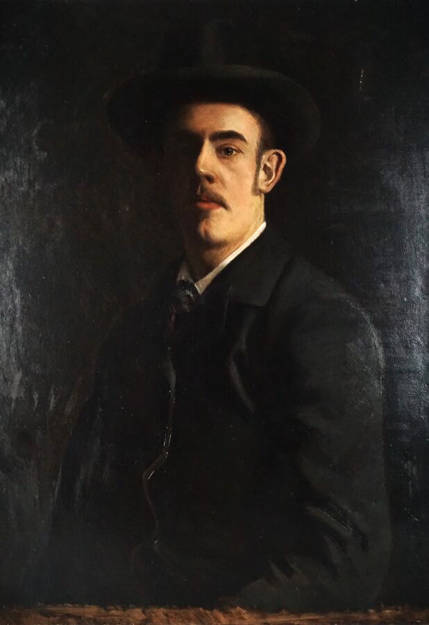 Ecole française du début du 20ème siècle, "Portrait d'homme au chapeau", huile sur toile non signée, 81 x 62 cm (petites griffures).