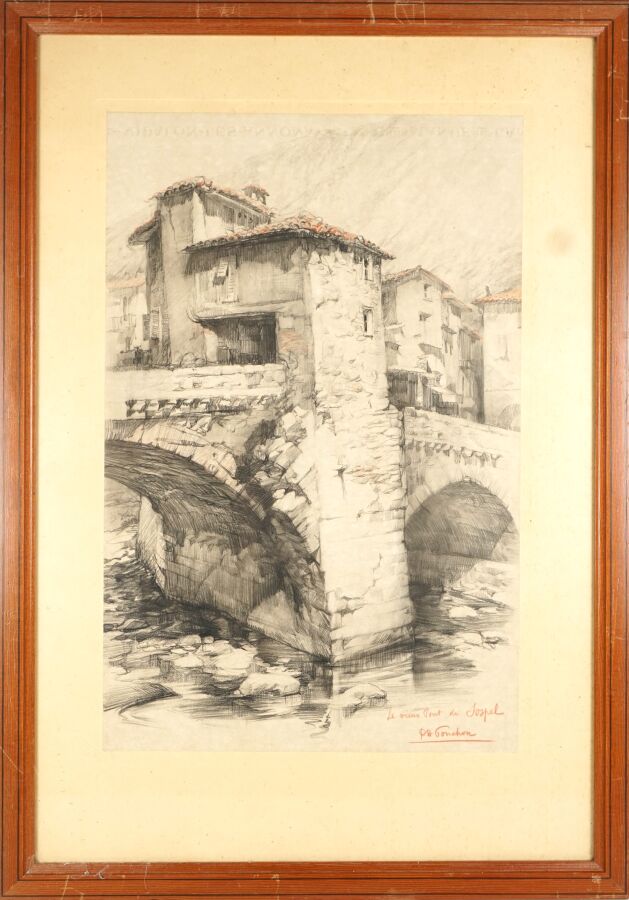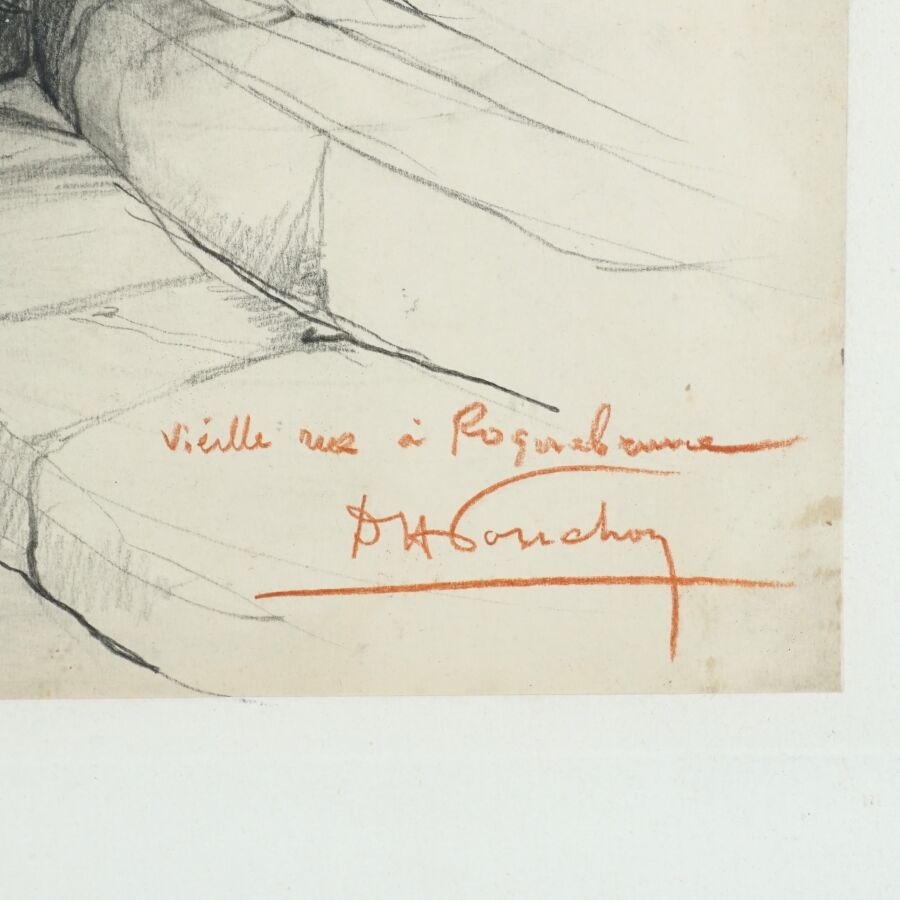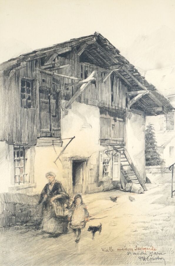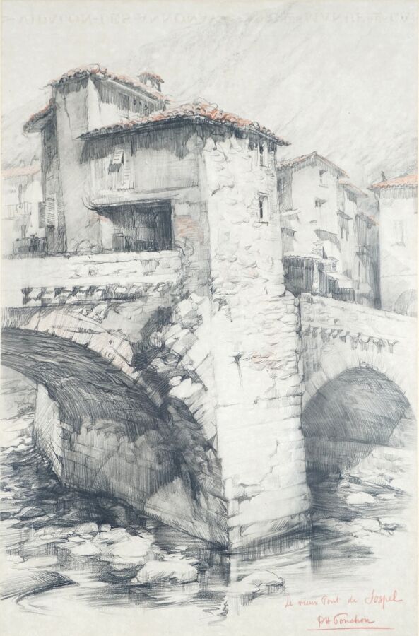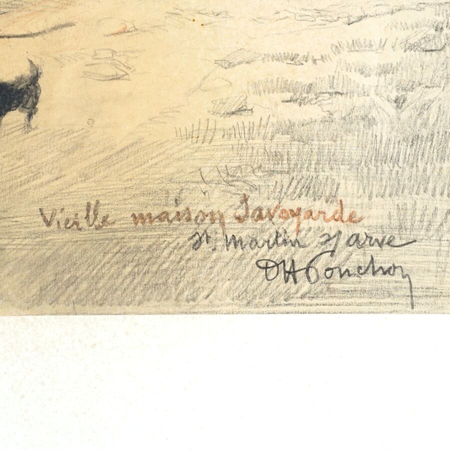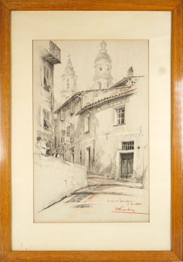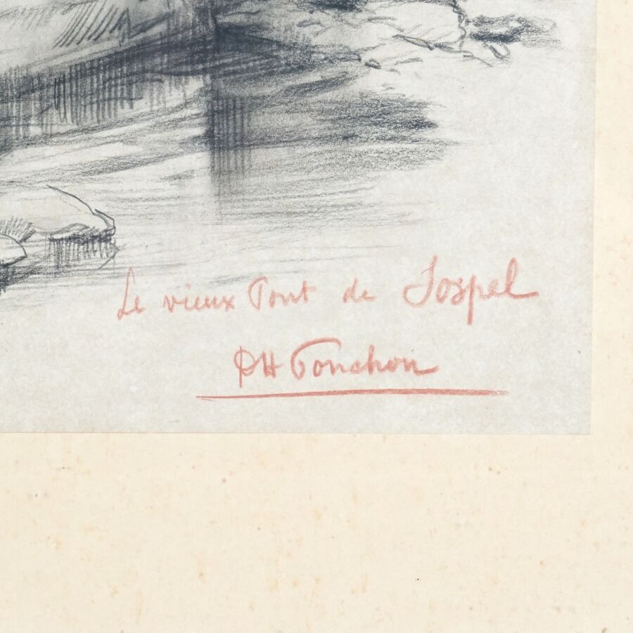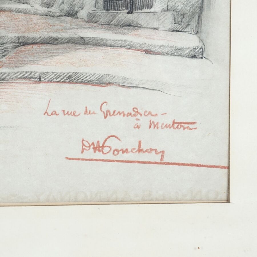 École française du début du 20ème siècle, "Vieilles maisons savoyardes à Saint-Martin", "Palmiers à Ganovan", "La rue des grenadiers, Menton", "Le vieux pont de Jospel" et "Vieille rue à Roquebrune", cinq dessins au fusain et rehauts au pastel, signés "GONCHON (?)" et titrés en bas à droite, 47 x 31.5 cm.