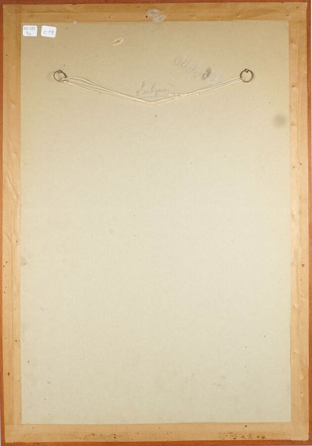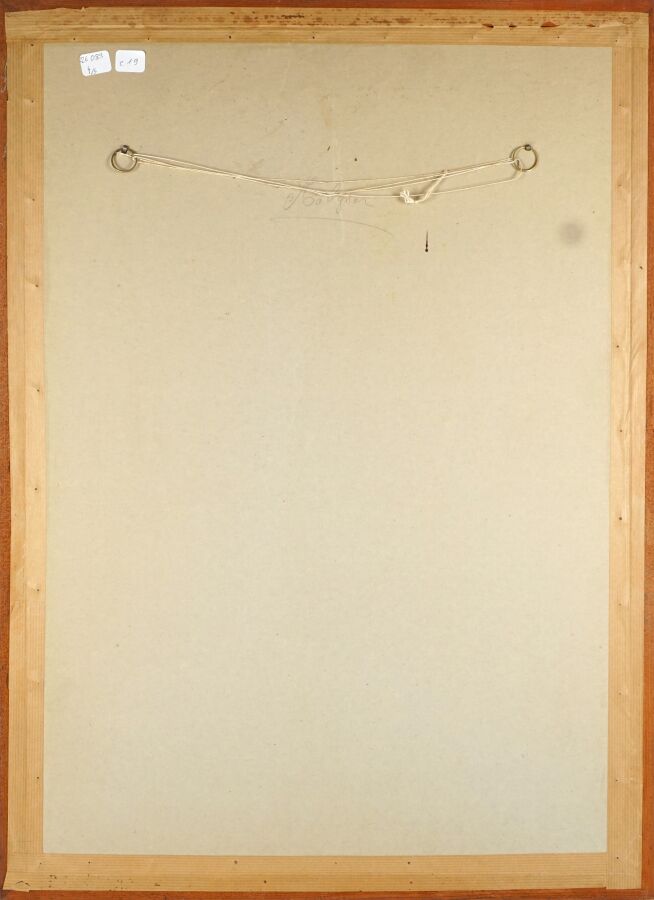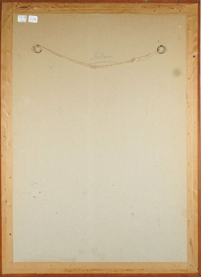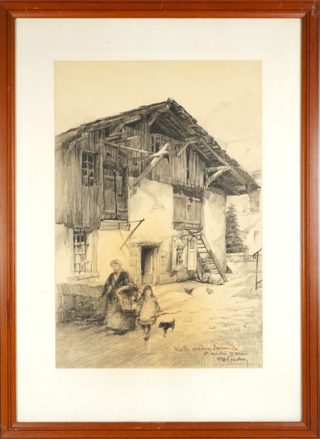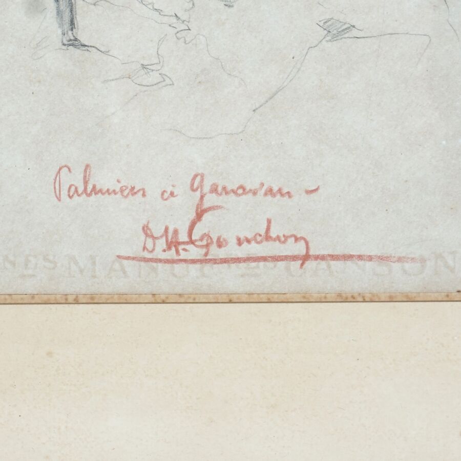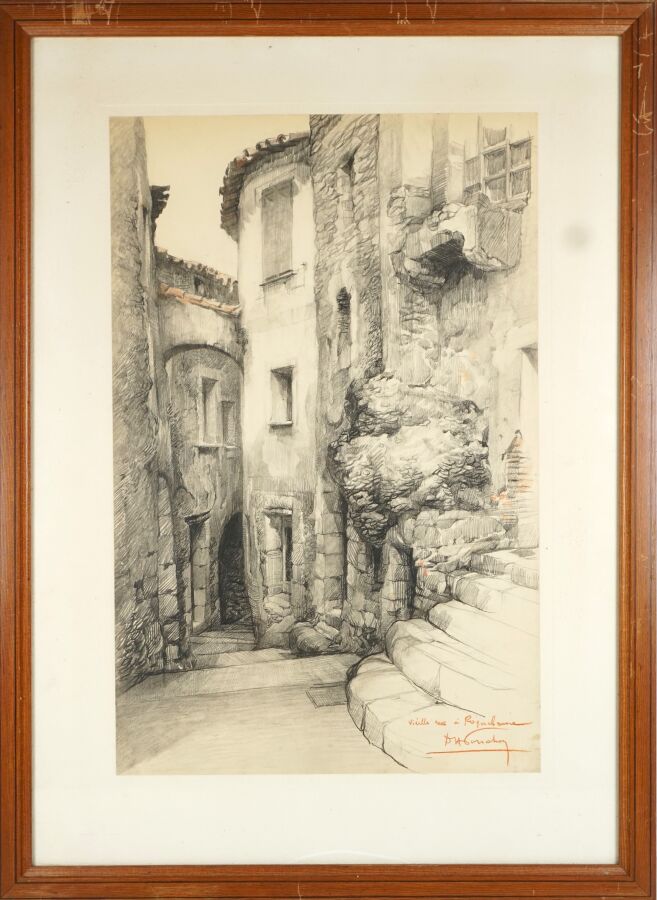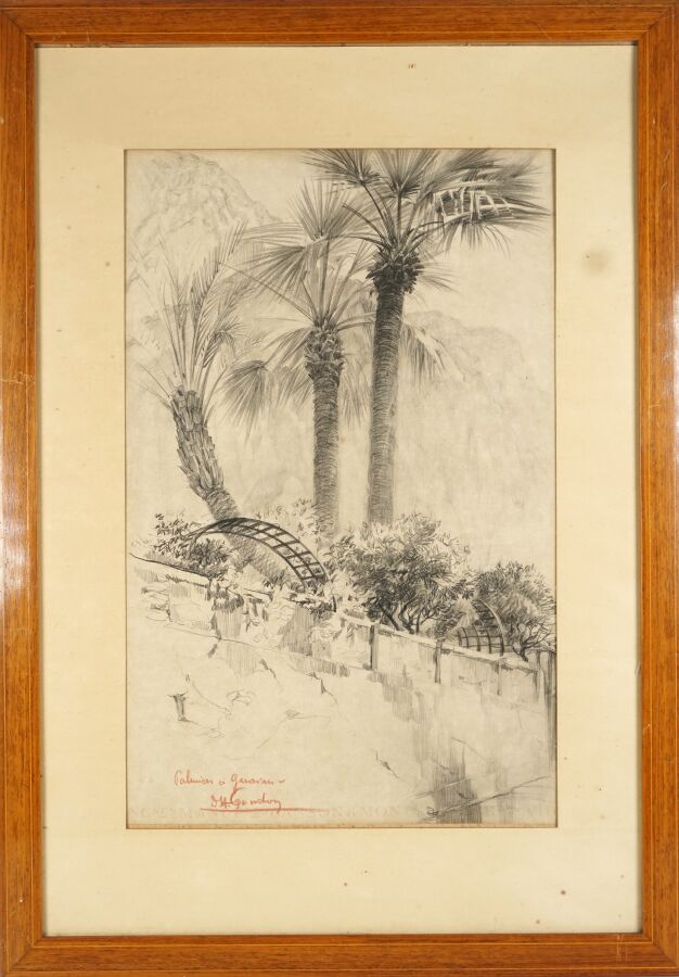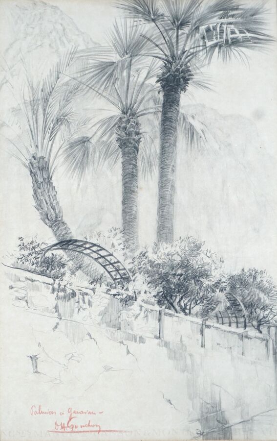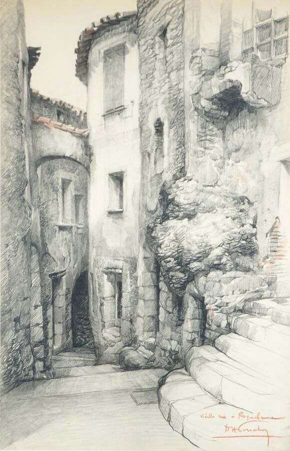 École française du début du 20ème siècle, "Vieilles maisons savoyardes à Saint-Martin", "Palmiers à Ganovan", "La rue des grenadiers, Menton", "Le vieux pont de Jospel" et "Vieille rue à Roquebrune", cinq dessins au fusain et rehauts au pastel, signés "GONCHON (?)" et titrés en bas à droite, 47 x 31.5 cm.