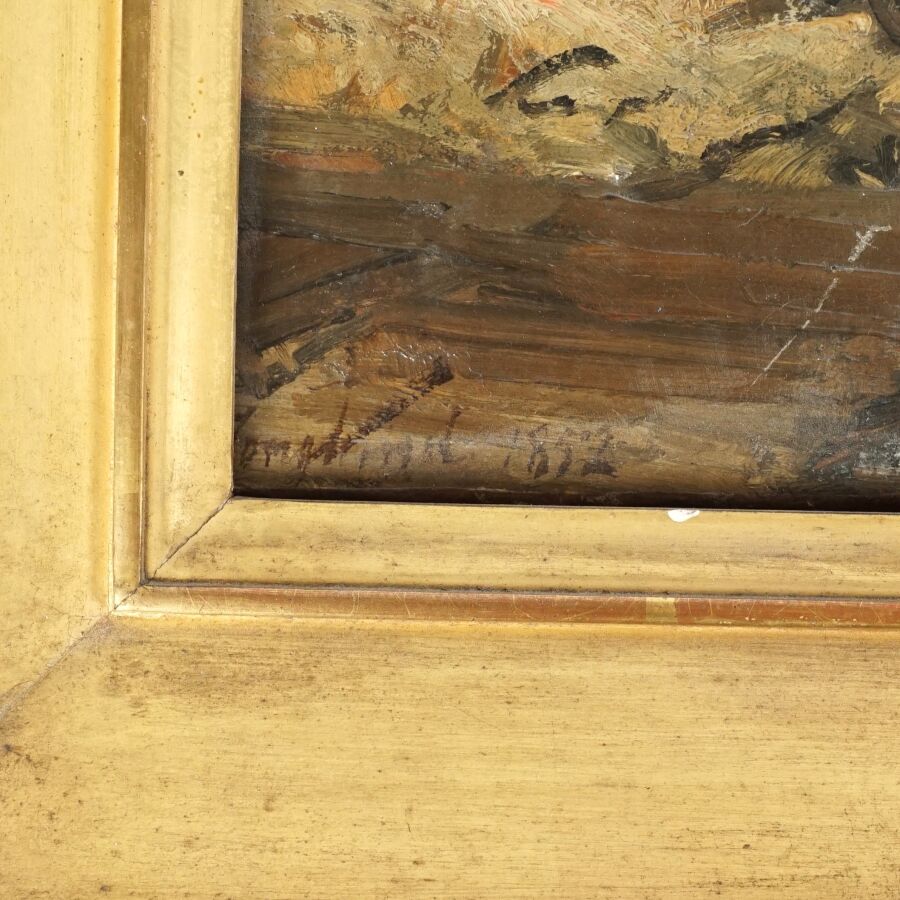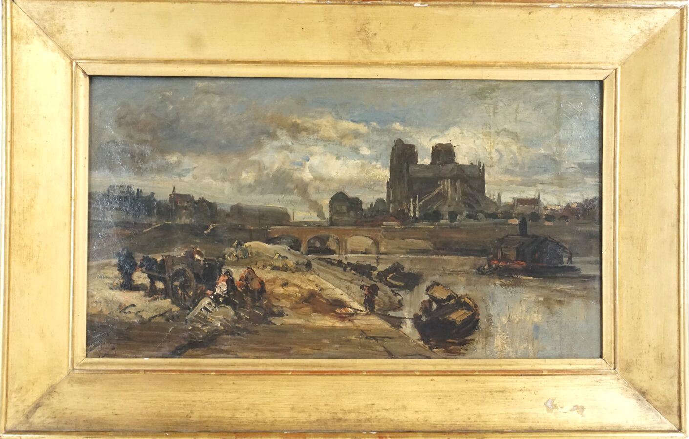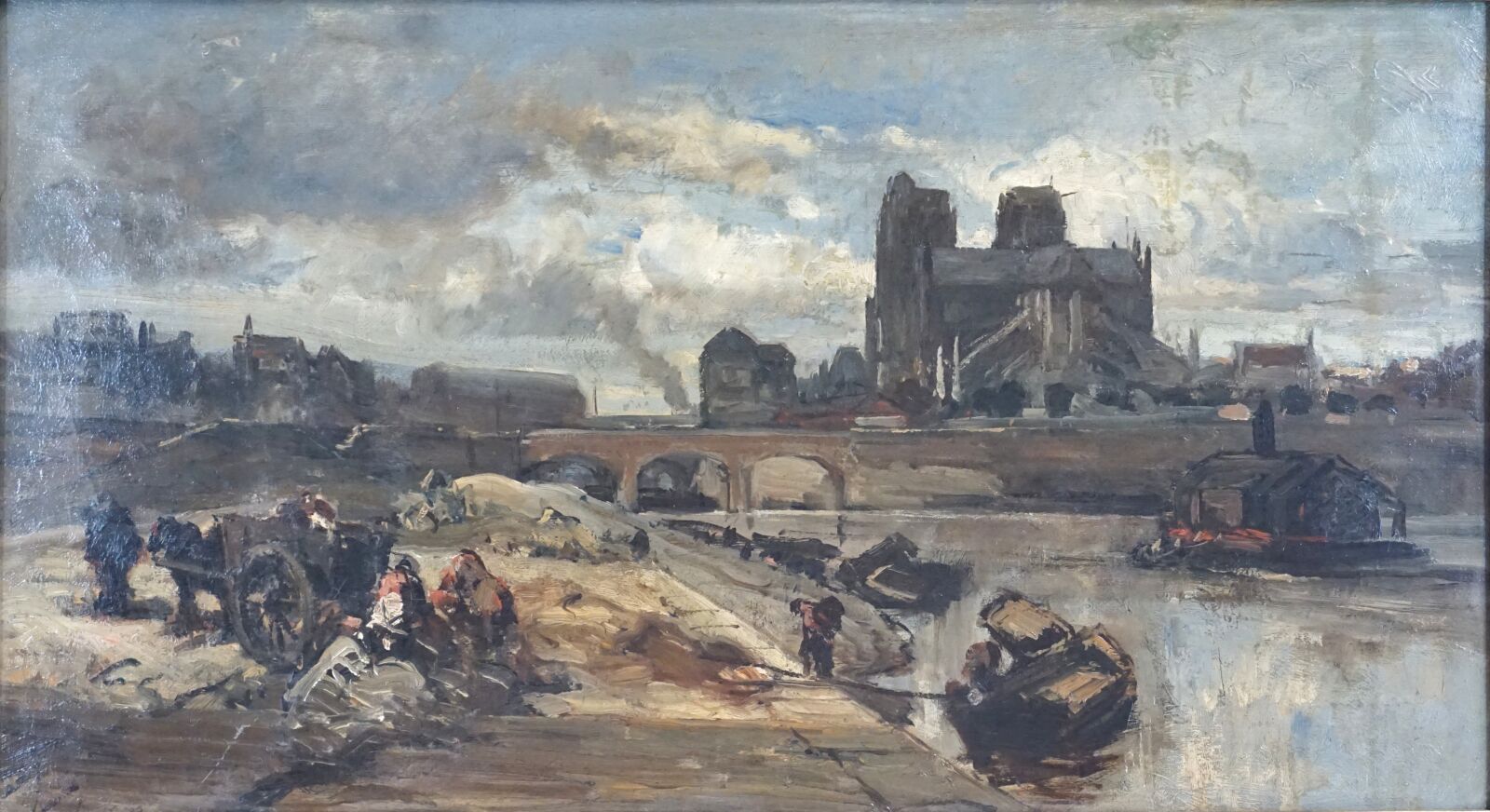 École Française seconde moitié du 19ème siècle, "Travaux sur les quais près de Notre-Dame, 1852" huile sur toile, signée et datée en bas à gauche , 31 x 57 cm.