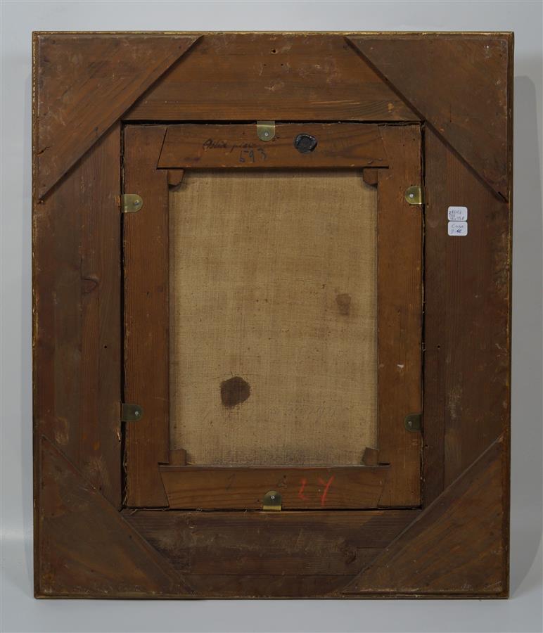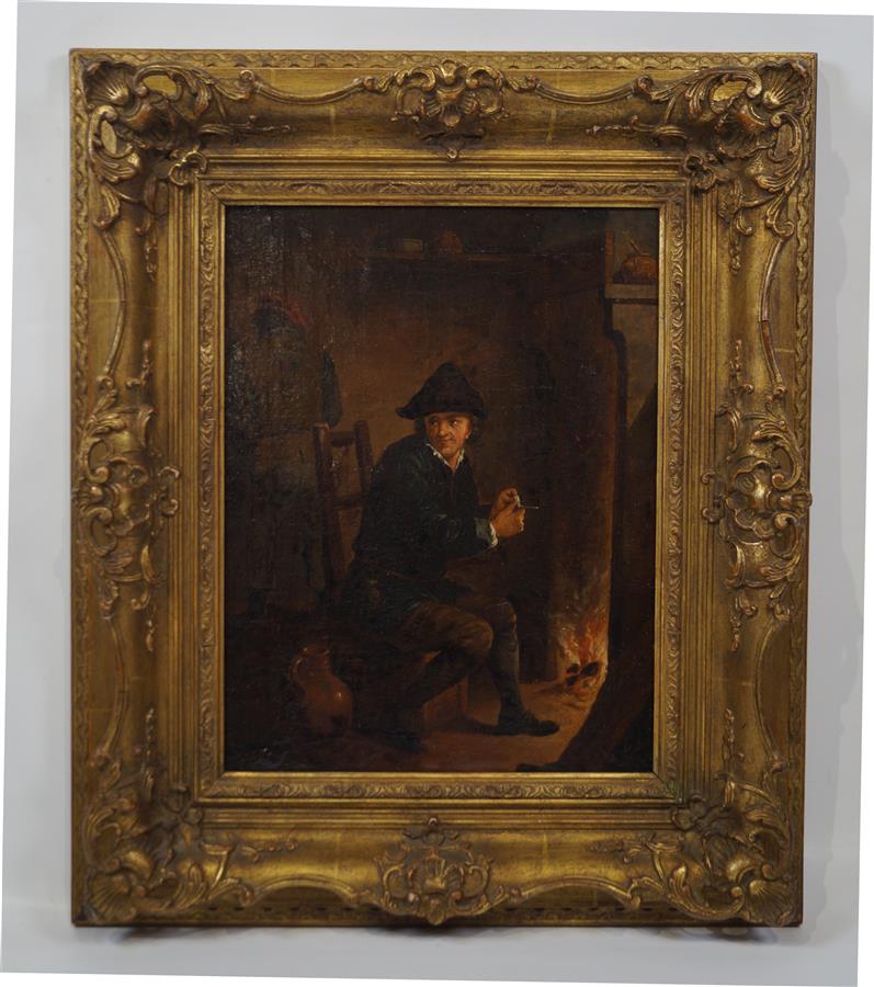 Ecole hollandaise du 19e siècle, "Homme à la pipe près du feu", huile sur toile, 44 x 33.8 cm (peinture craquelée)