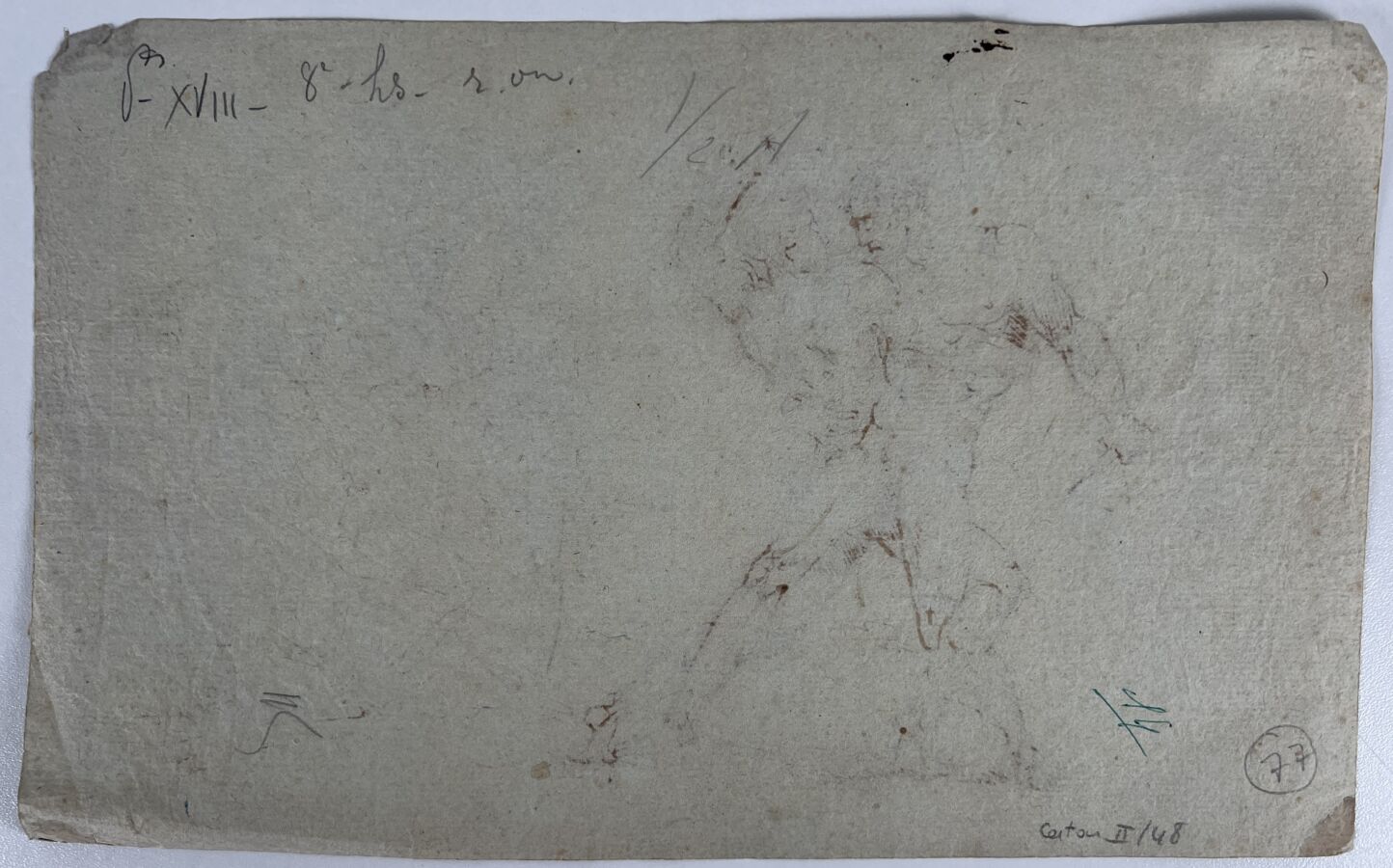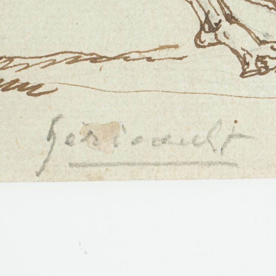 Ecole italienne néoclassique, "Deux guerriers s'affrontant", plume et encre brune sur papier mi-teinte, annoté « Géricault » en bas au centre au cn, 18 x 28 cm (pliures et petites taches).