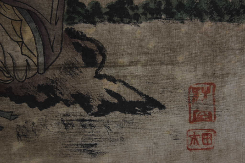 Ecole Japonaise du 20e siècle "Sage et son élève sous un arbre", aquarelle sur soie, cachet en bas à droite, 38 x 28 cm.
