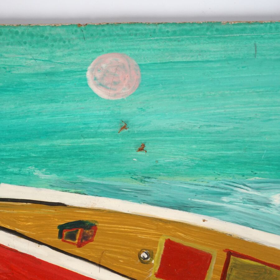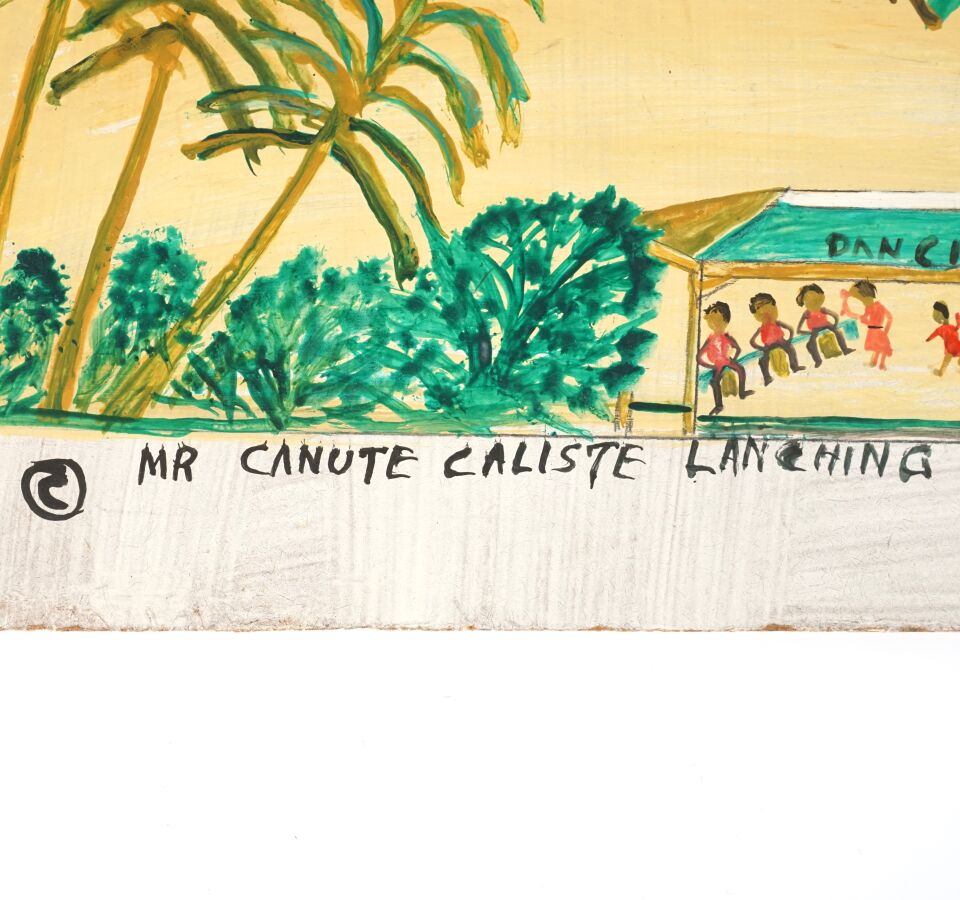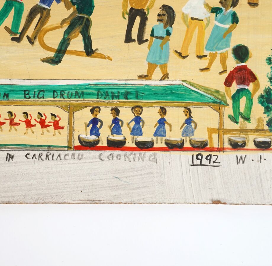 École moderne, "Mr. Canute Caliste lanching in Carriacou cooking" 1992, huile sur isorel signée du monogramme "W.I" et datée en bas à droite, 30.5 x 39.5 cm (petits trous).