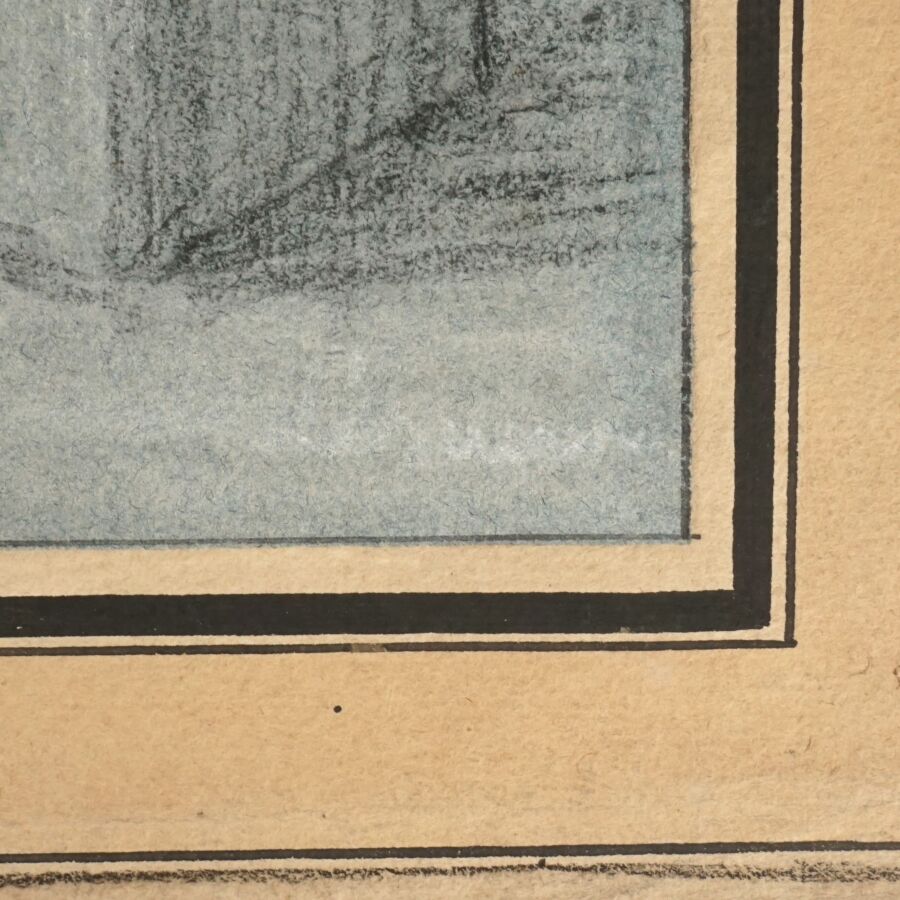 Ecole Néoclassique de la fin du 18ème siècle, "Personnage assis", dessin au fusain et rehauts de craie sur papier bleu, trace de signature en bas à droite, 36.5 x 40.5 cm (à vue) (tache d'humidité).