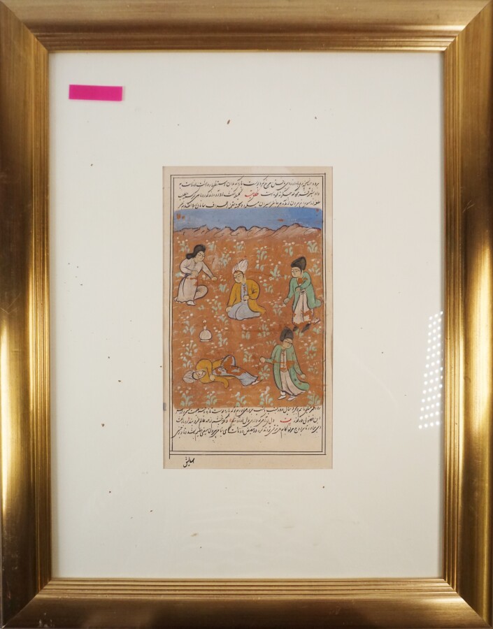 Ecole persane du 20ème siècle, "Personnages", aquarelles et gouache sur papier, 25 x 14 cm (usures).