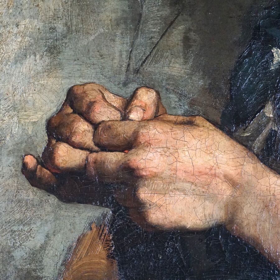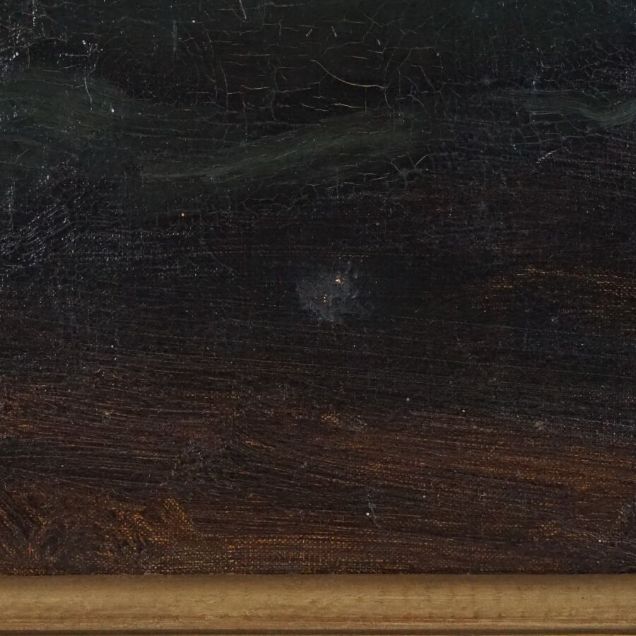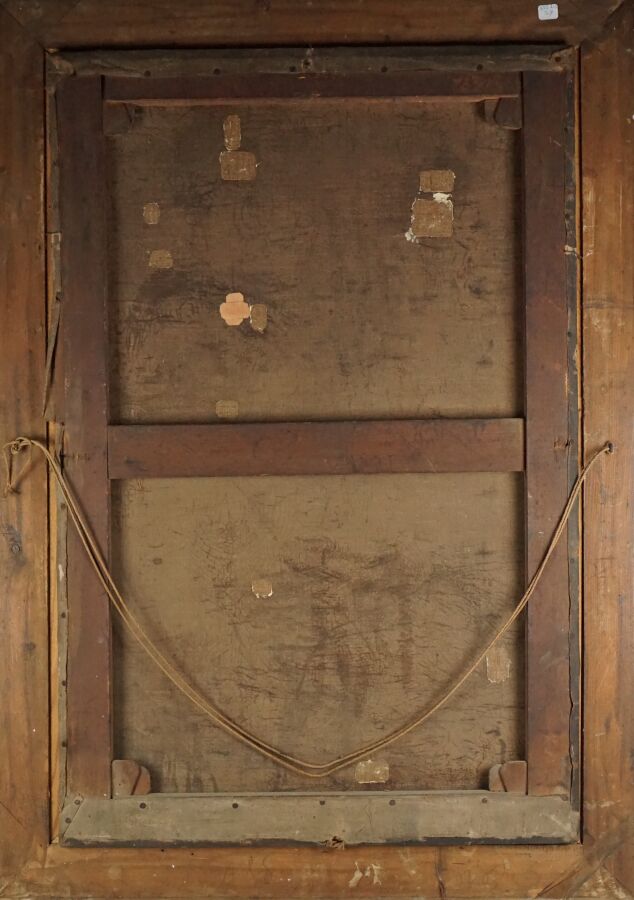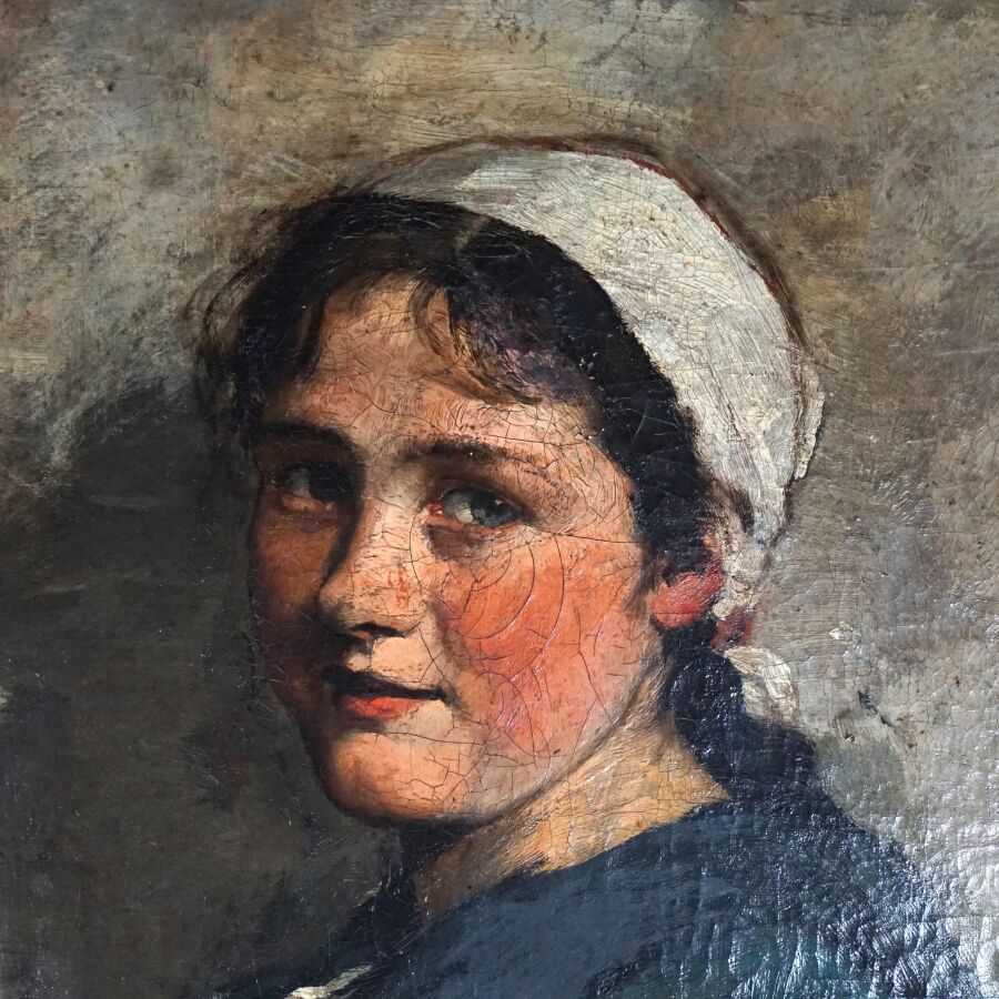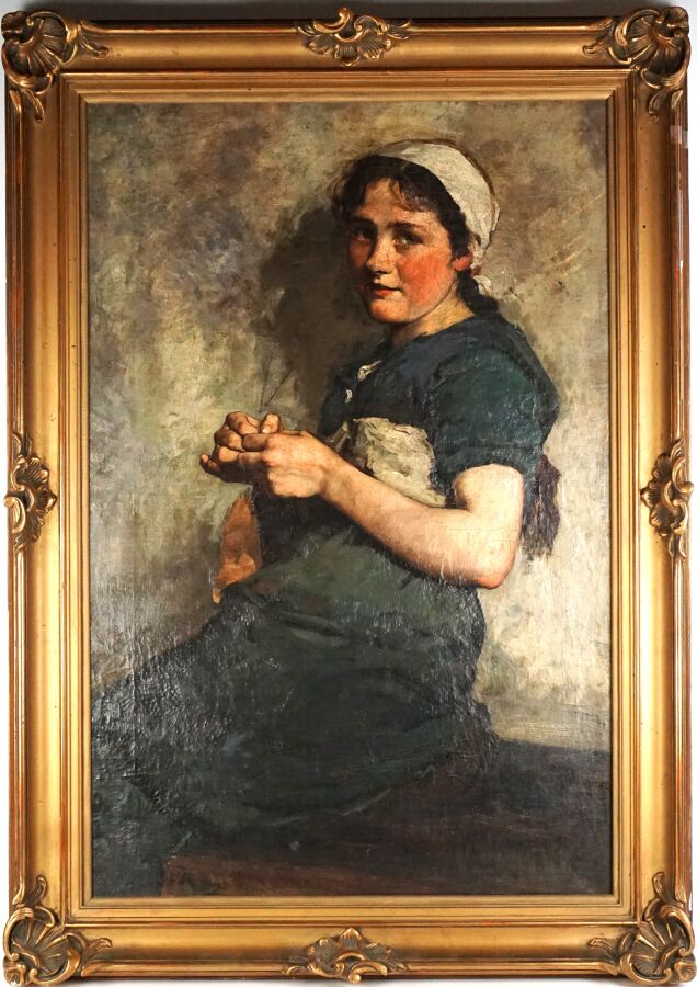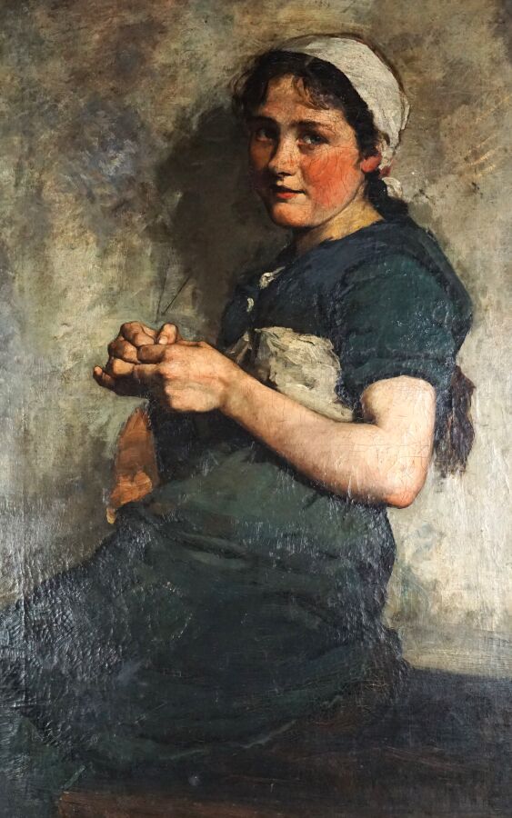 École réaliste du 19ème siècle, "Jeune paysanne à son ouvrage", huile sur toile, non signée, 90 x 59 cm (légers manques, quelques restaurations, craquelures).
