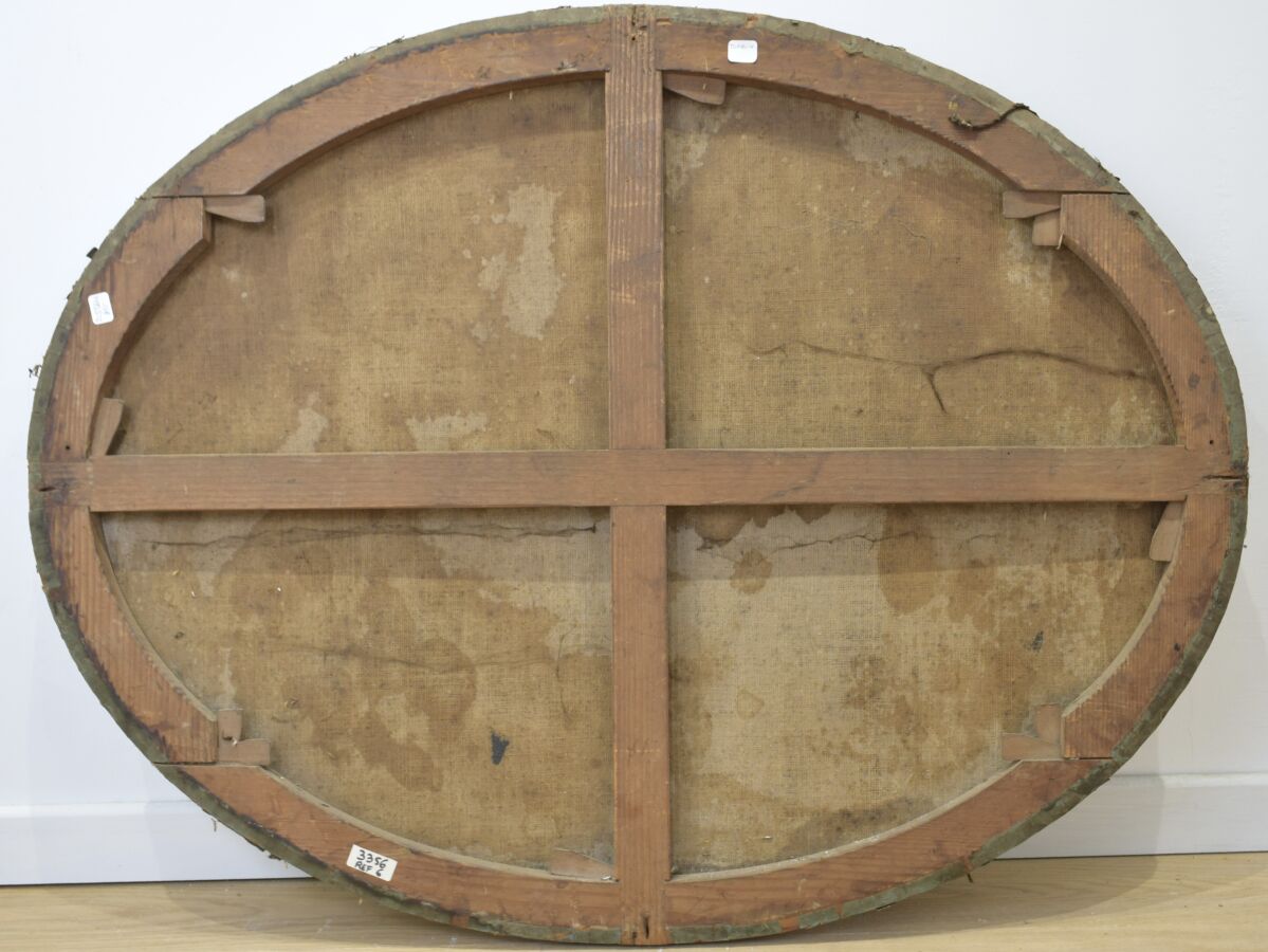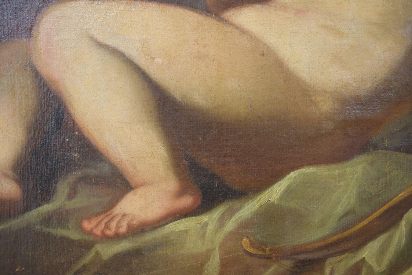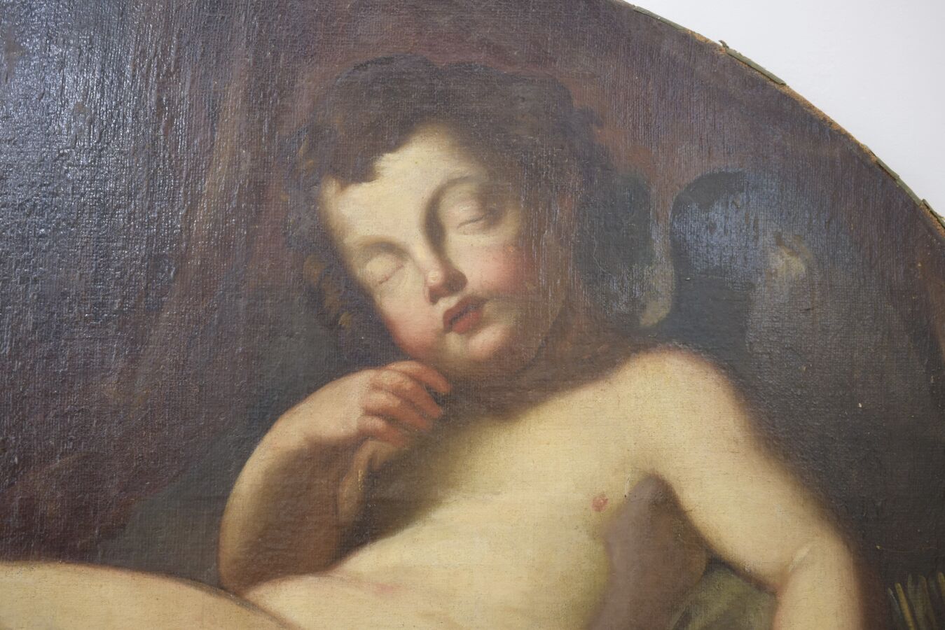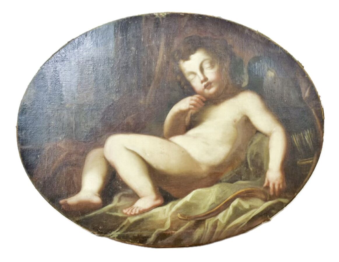 École romaine du 18ème siècle, "Putto endormi", huile sur toile, 72 cm x 94 cm, (importantes restaurations.)