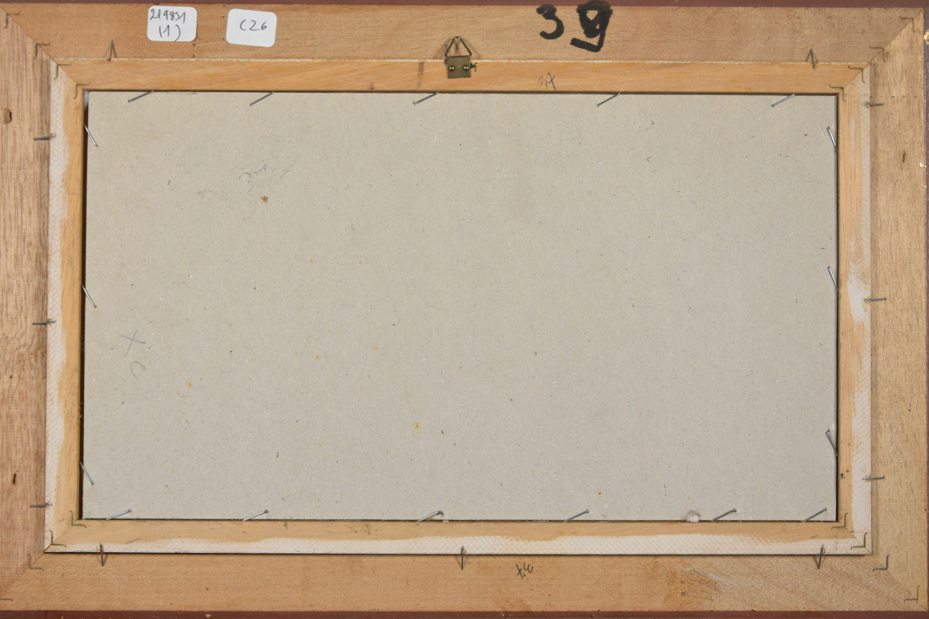 Ecole russe de la seconde moitié du 20e siècle, "Bord de lac", huile sur carton, traces de signature en bas à droite, 18 x 22 cm.