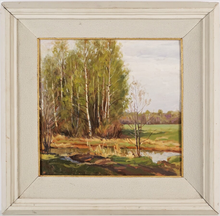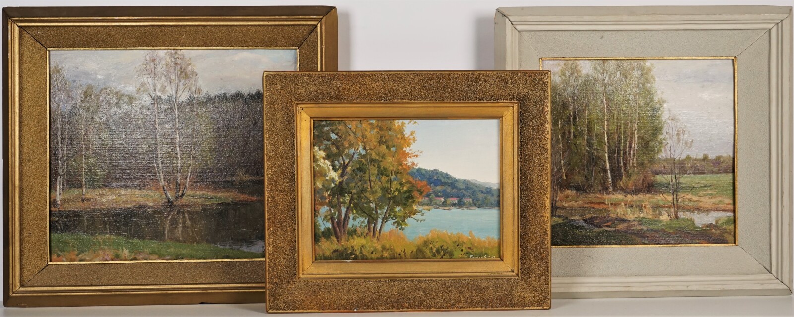 Ecole Russe du 20e siècle, "Paysage arboré près d'un point d'eau" ensemble de trois huiles sur carton, l'une signée et datée 1989 en bas à droite, signées, titrées et datées au dos, 19.5 x 25.5 cm ; 31 x 35.5 cm et 27 x 28 cm.
