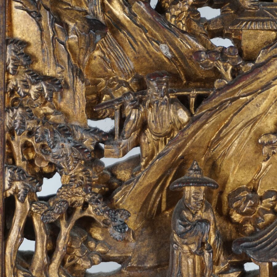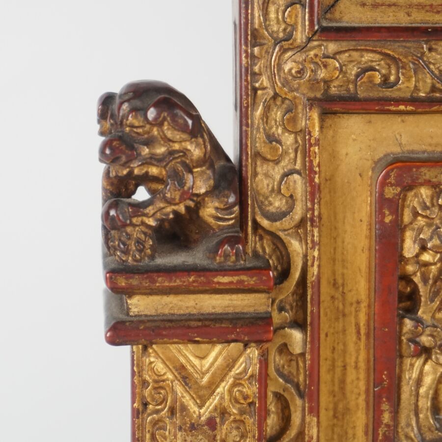 Ecran de lettré en bois de Ningbo laqué rouge et or, à décor ajouré de loirs évoluant parmi des rinceaux, fruits et personnages en médaillon central dans un paysage de Montagne et pins de longévité, Province de Canton, Chine, circa 1880 - 1900, H. 61 cm. (très léger manque à un pied, décollement)