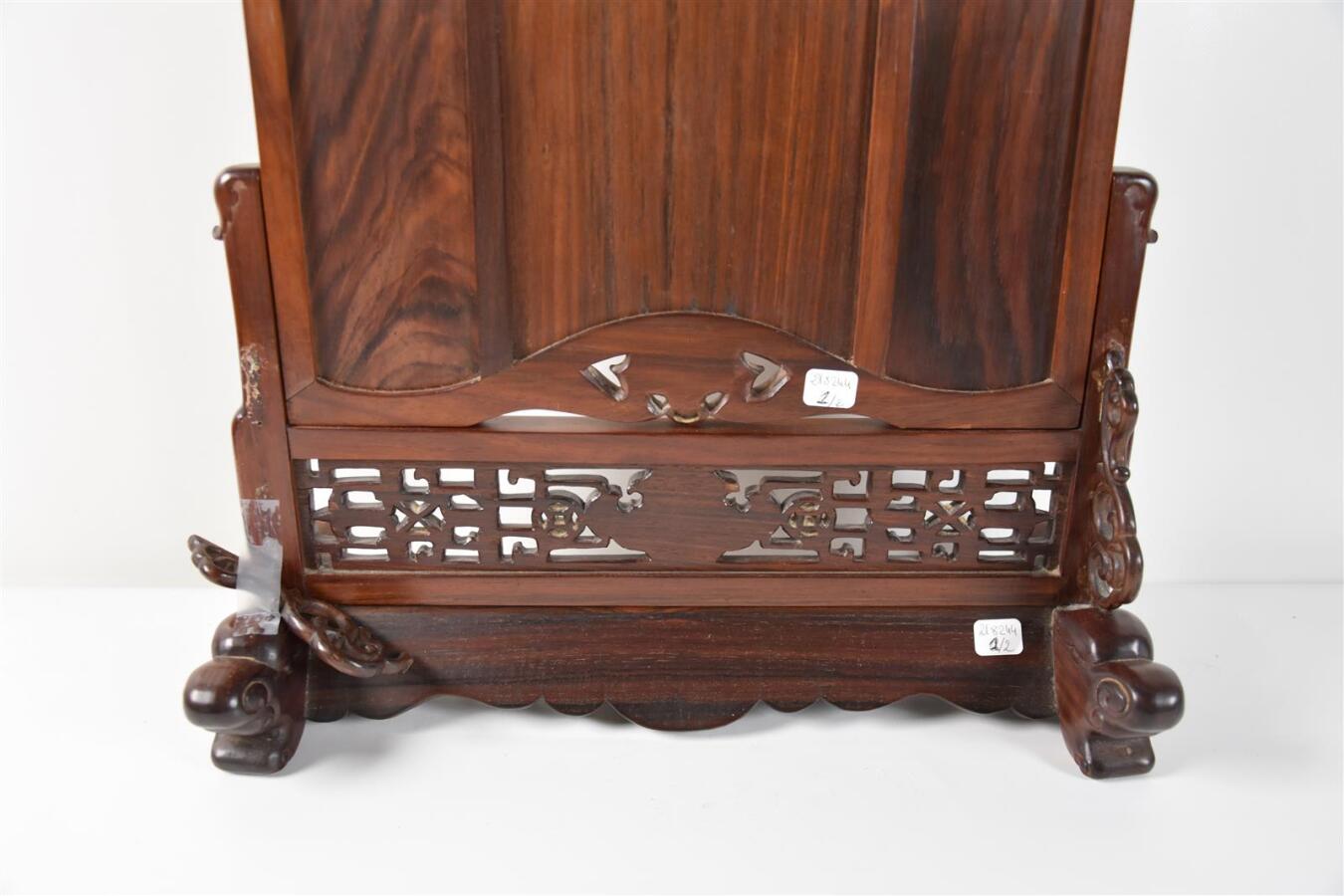 Ecran de table en bois de rose et incrustations de nacre, reposant sur son piètement, la partie supérieure finement sculptée de 2 dragons poursuivant le joyau sacré, l'écran reprenant la forme d'une peinture est décoré de 2 bouquets fleuris et d'un poème calligraphié, Vietnam vers 1900, travail Nam Dinh, 40 x 17.5 x H. 50 cm (un élément à recoller)