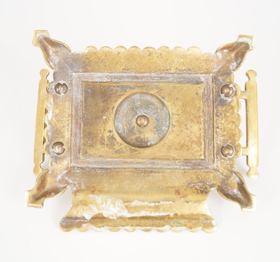 Ecritoire en bronze avec son encrier et plumier à décor de ferronnerie, époque IIIe République, L. 19 cm (éclat au réservoir en verre, quelques oxydations).