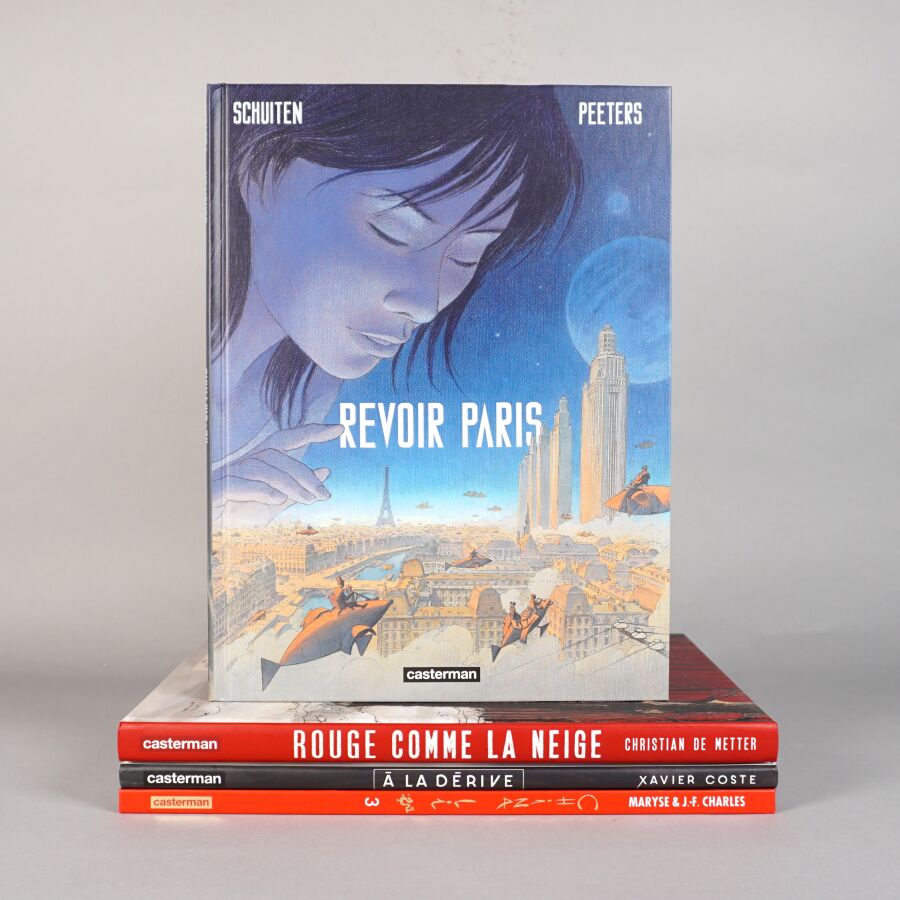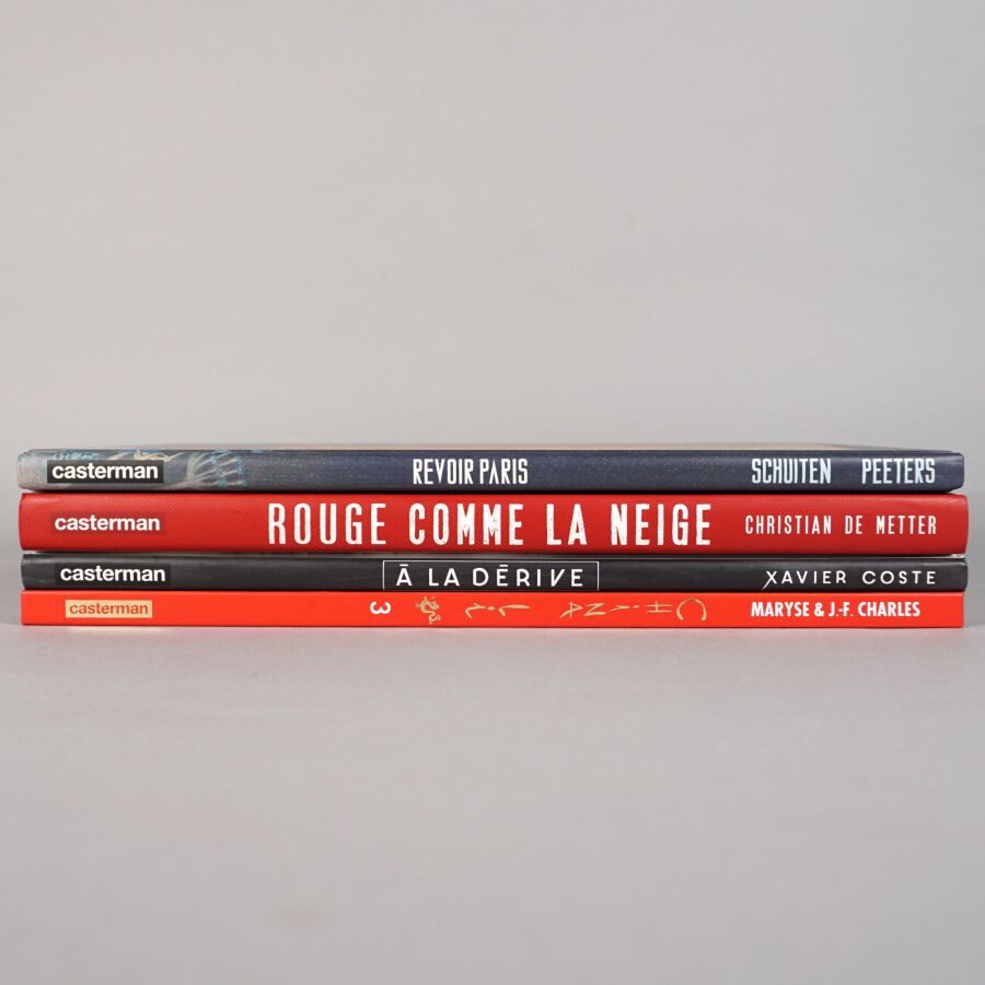 Éd. CASTERMAN : Ensemble de 4 albums comprenant "Revoir Paris", "Rouge comme la neige", "A la dérive" (dédicacé par Xavier COSTE) et CHINA LI (tome 3, doublement dédicacé par Maryse et Jean-François CHARLES).