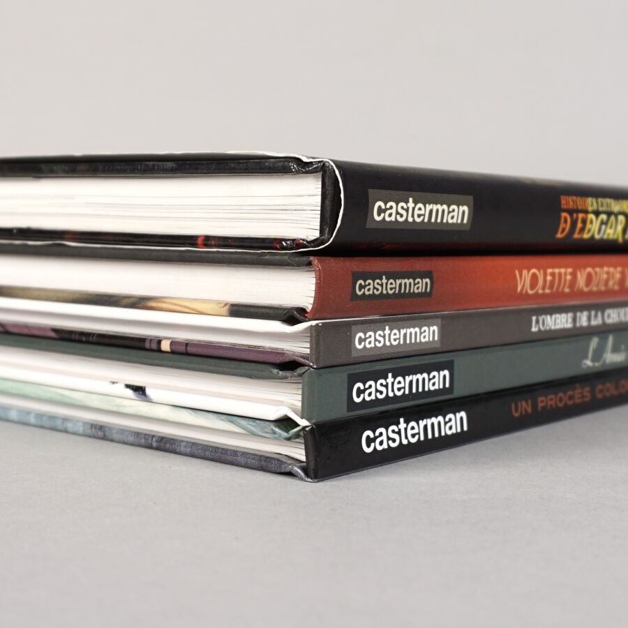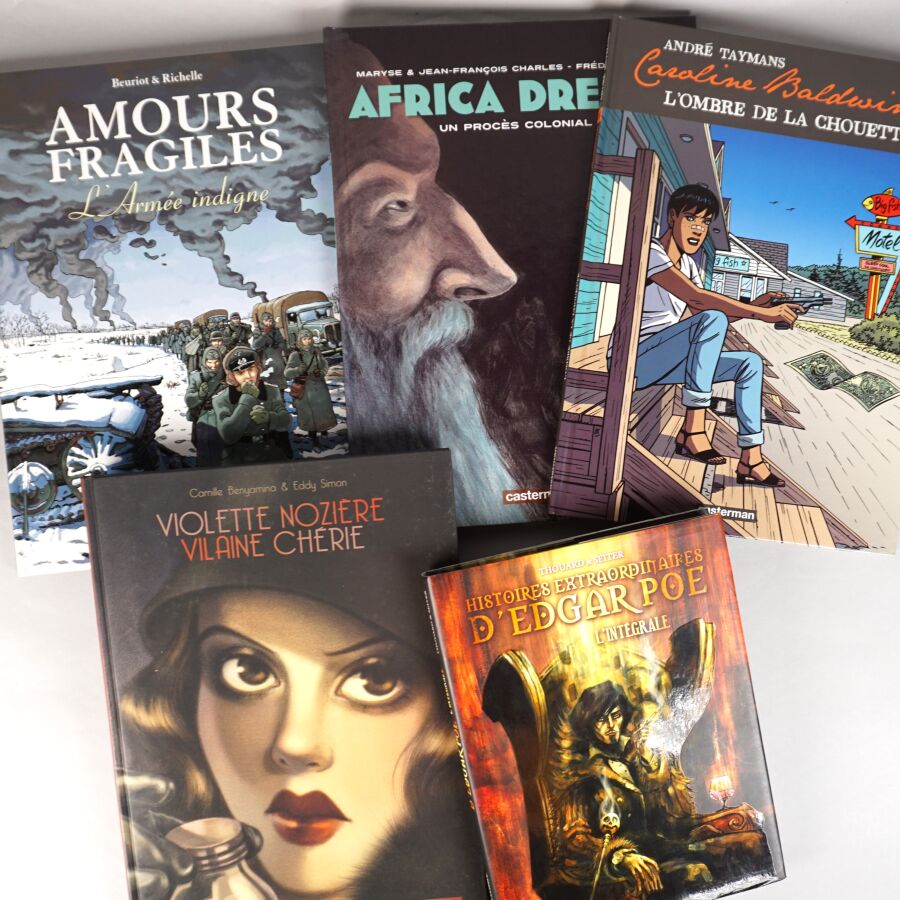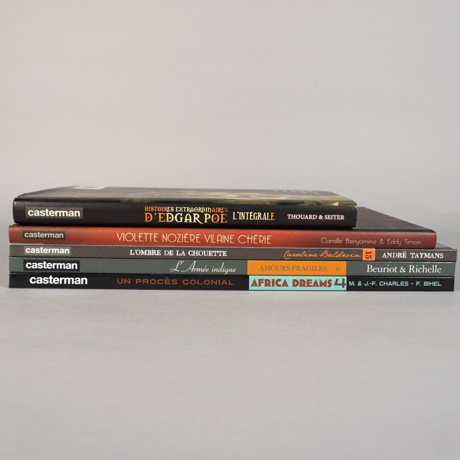 Éd. CASTERMAN : Ensemble de 5 albums comprenant AMOURS FRAGILES (tome 6), AFRICA DREAMS (tome 4), CAROLINE BALDWIN (tome 15 dédicacé par TAYMANS), "Violet Noziere, Vilaine Chérie" et l'album petit format "L'intégral des histoires extraordinaires d'Edgar Poe" (dédicacé par THOUARD).