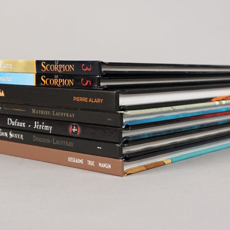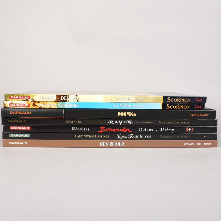 Éd. DARGAUD : Ensemble de 7 albums comprenant LONG JOHN SILVER (tome 1), BARRACUDA (tome 4 en première édition), RAVEN (tome 1 en première édition), "Don Vega" en première édition, "Non-retour" dédicacé par JUSSEAUME en première édition et LE SCORPION (tomes 3 et 5, le tome 3 en première édition).