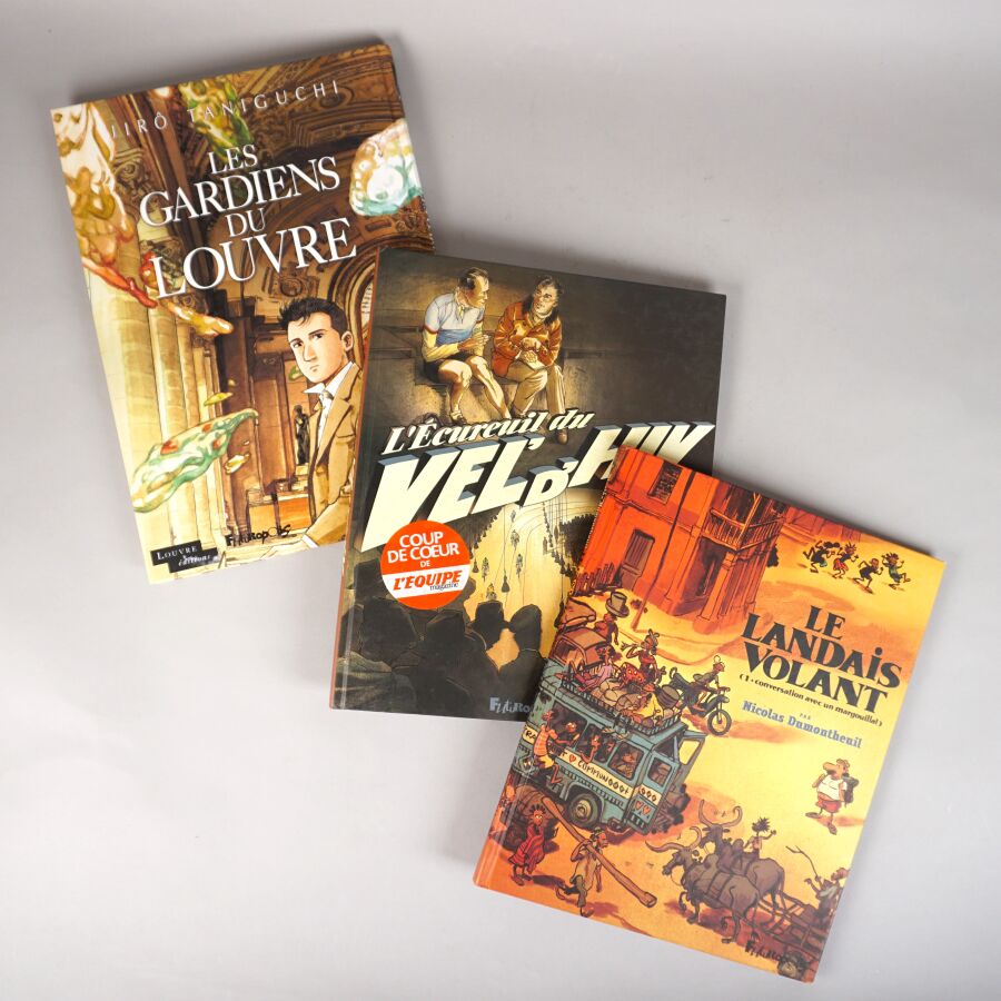 Éd. FUTUROPOLIS : Ensemble de 3 albums comprenant "Les gardiens du Louvre", "L'écureuil du Vel'd'Hiv" (dédicacé par Christian LAX) et "Le landais volant" (tome 1).