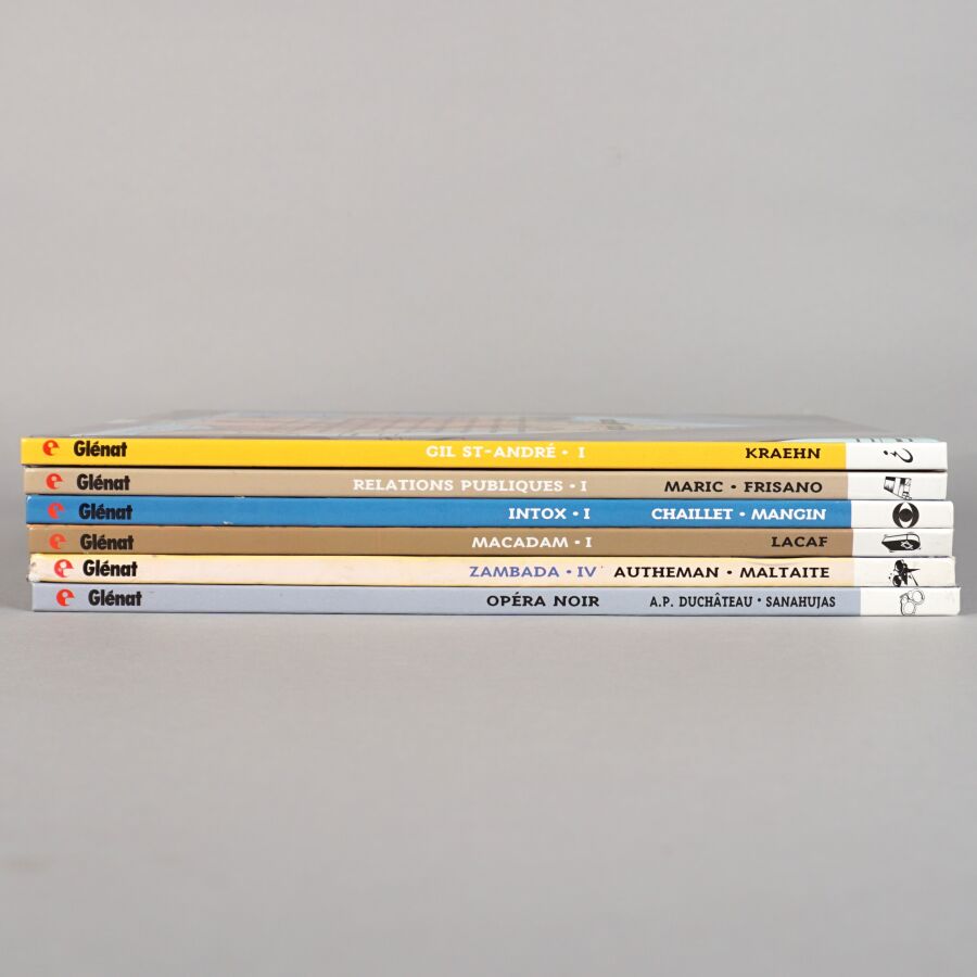 Éd. GLÉNAT, collection Bulle noire : Ensemble de 6 albums comprenant GIL ST ANDRÉ (tome 1), RELATIONS PUBLIQUES (tome 1), INTOX (tome 1), MACADAM (tome 1), "Opéra noir" et ZANBADA (tome 4).