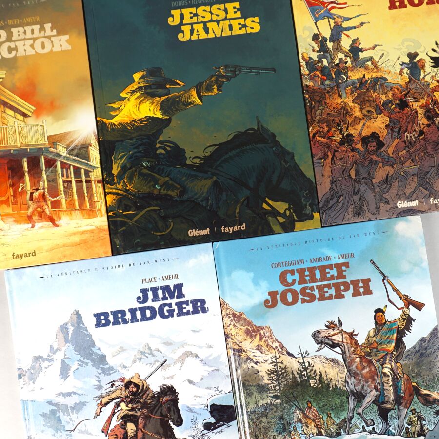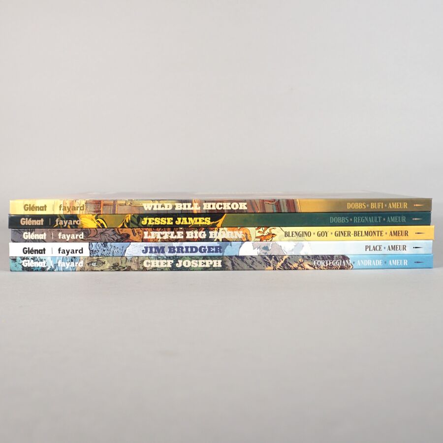 Éd. GLÉNAT, collection La véritable histoire du Far west : Ensemble de 5 albums comprenant "Chef Joseph", "Jim Bridger", "Little big horn", "Jesse James" et "Wild Bill Hickok".